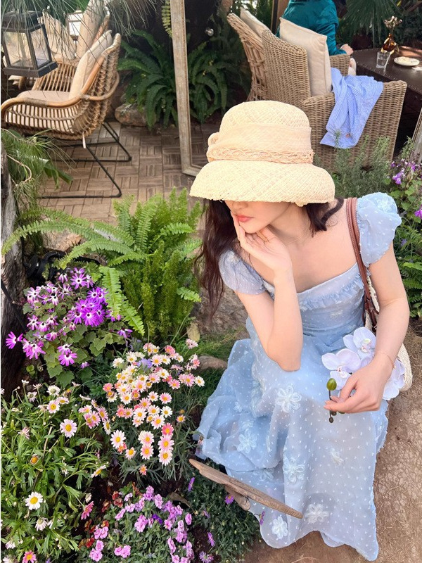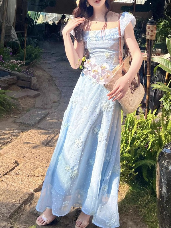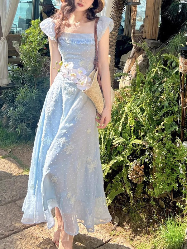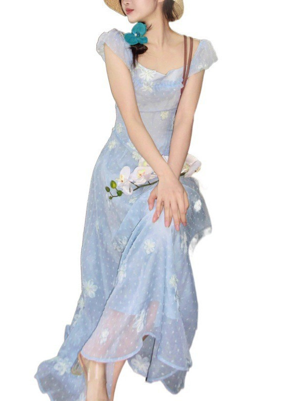 海盐苏打法式仙气度假风蓝色点点显瘦连衣裙大摆飞飞袖长裙夏季裙