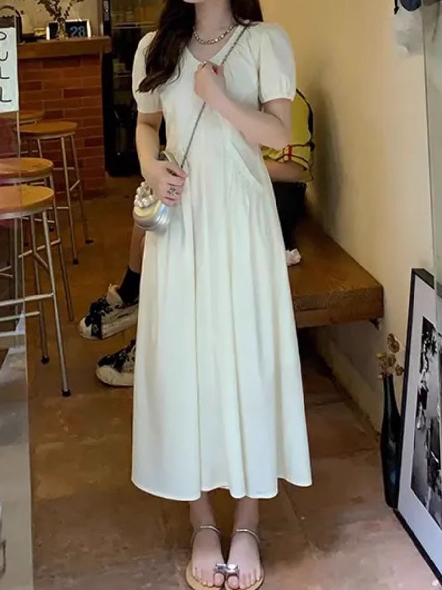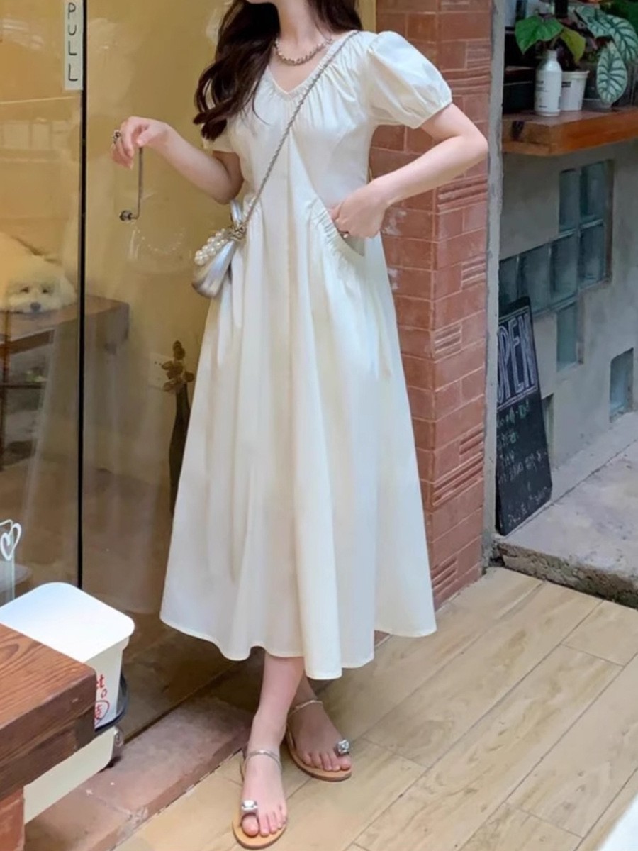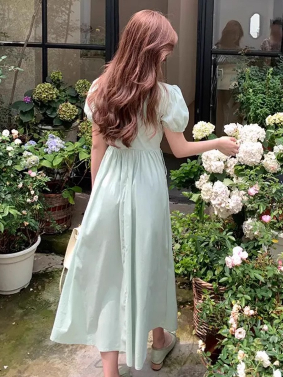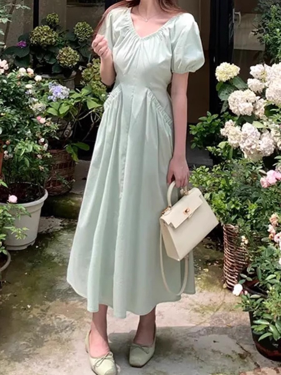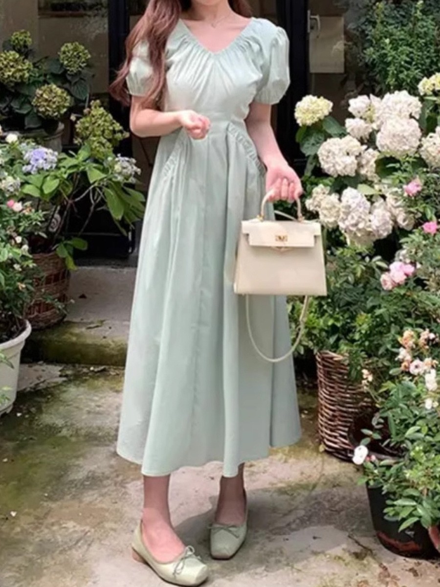 夏季高腰气质V领香草薄荷绿连衣裙收腰显瘦褶皱设计感洋气长裙女