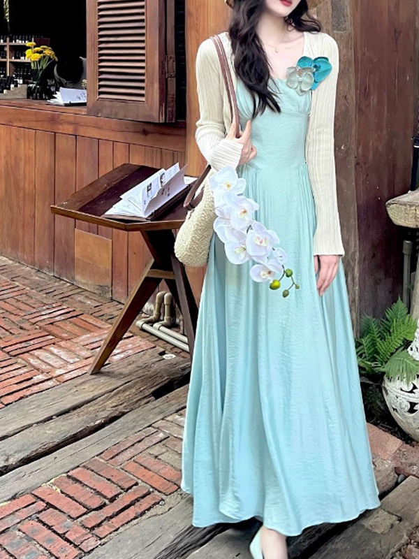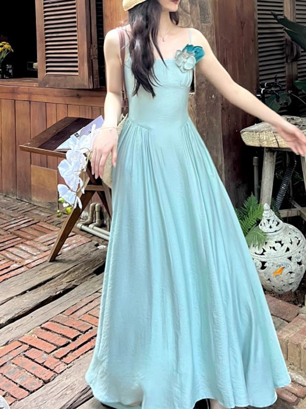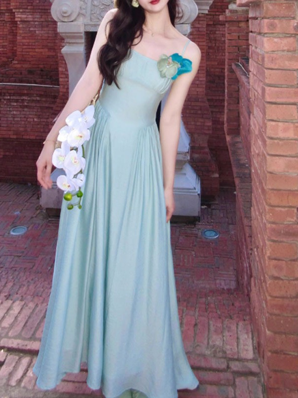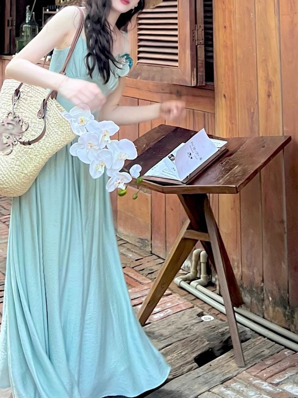新款 蓝绿色大摆法式气质连衣裙仙气度假显瘦高级感长裙