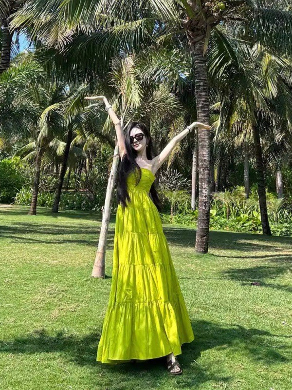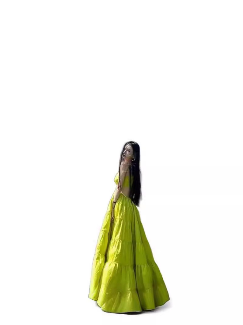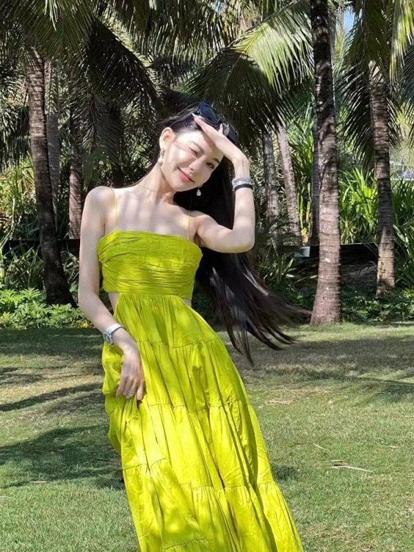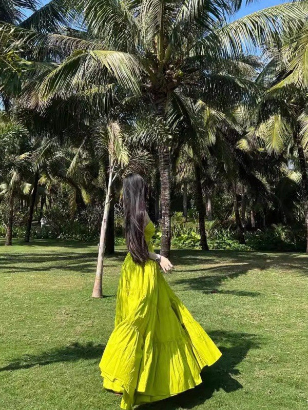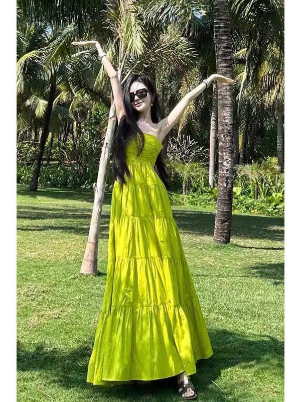 三亚海边度假连衣裙女拍照高级感收腰大摆沙滩长裙绿色性感吊带裙