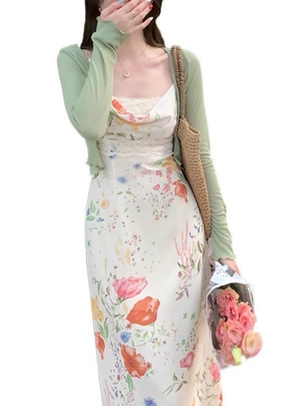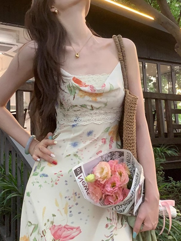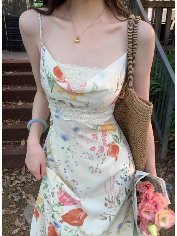 夏季新款 法式复古碎花雪纺吊带连衣裙女夏季印花温柔长裙