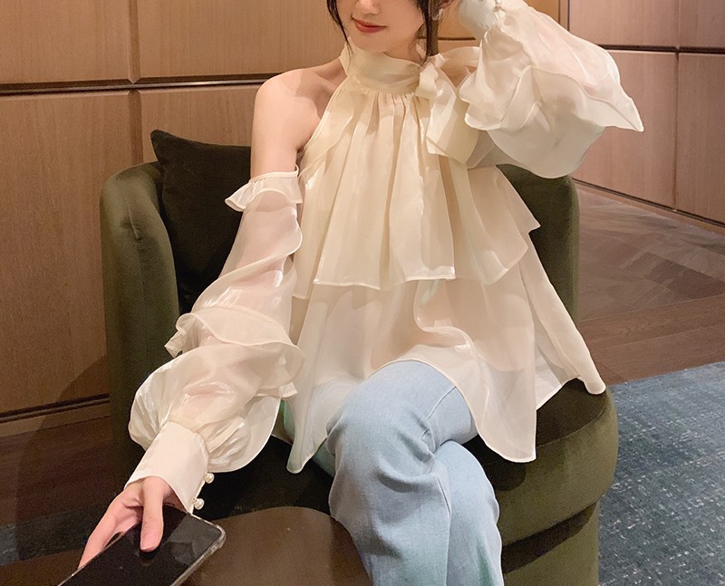 法式雪纺露肩无袖挂脖上衣设计感小众女夏季新款仙气气质衬衫衬衣