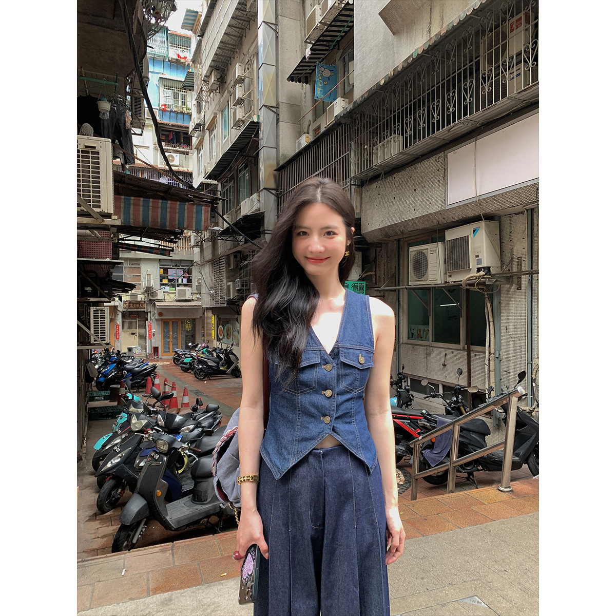 诠释美NEW OPEN牛仔马甲女夏季法式无袖单排扣v领上衣82318