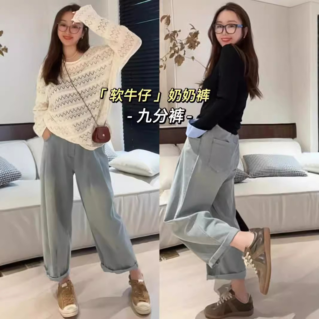 水洗浅蓝阔腿牛仔裤女夏松紧腰显瘦小个子休闲九分奶奶萝卜裤早秋