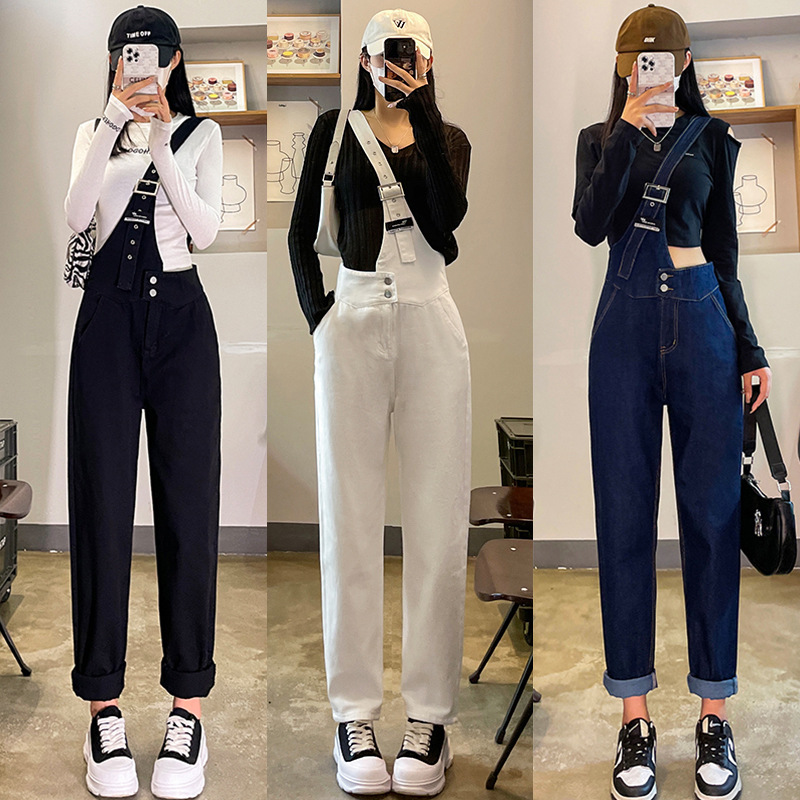 韩版休闲盐系单肩带牛仔背带裤女春夏小个子显瘦时尚哈伦裤女