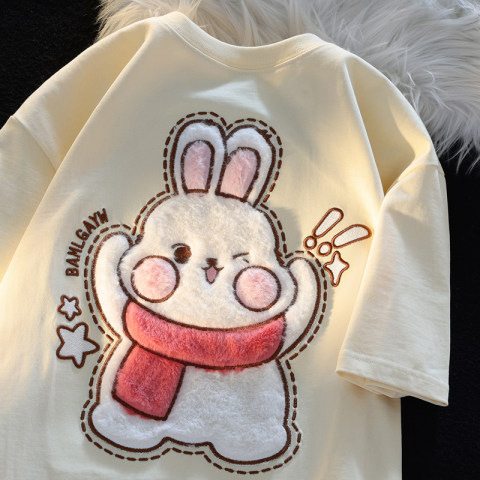 植绒胖墩小兔子短袖t恤女夏季毛巾绣宽松oversize设计感小众情侣