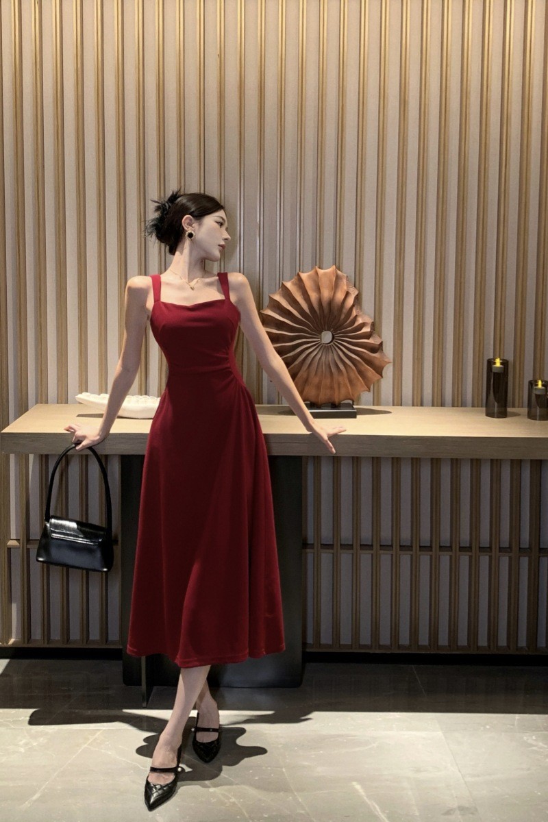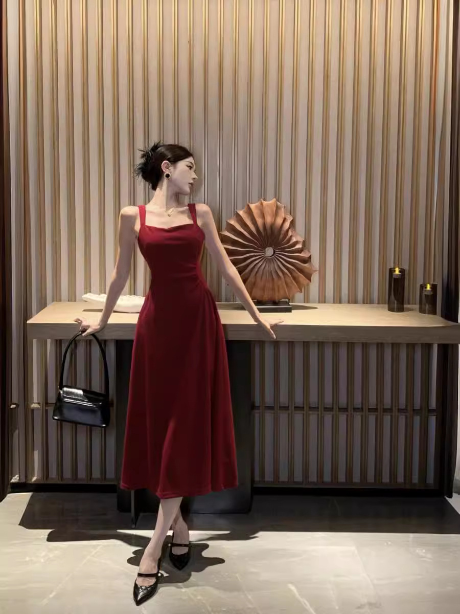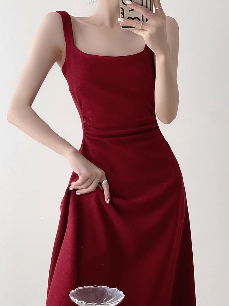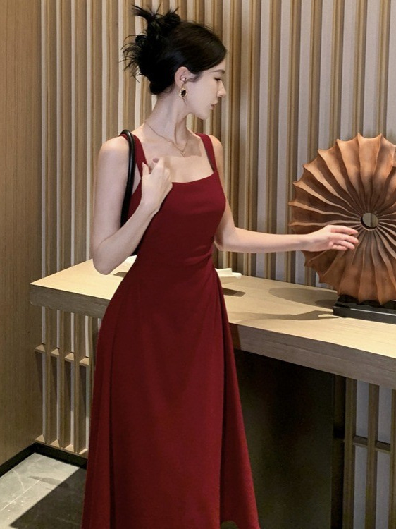 红色方领吊带连衣裙新款收腰显瘦日常可穿敬酒服订婚红裙子
