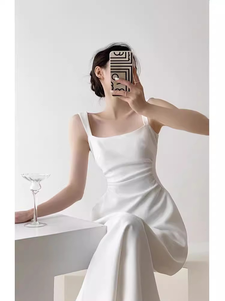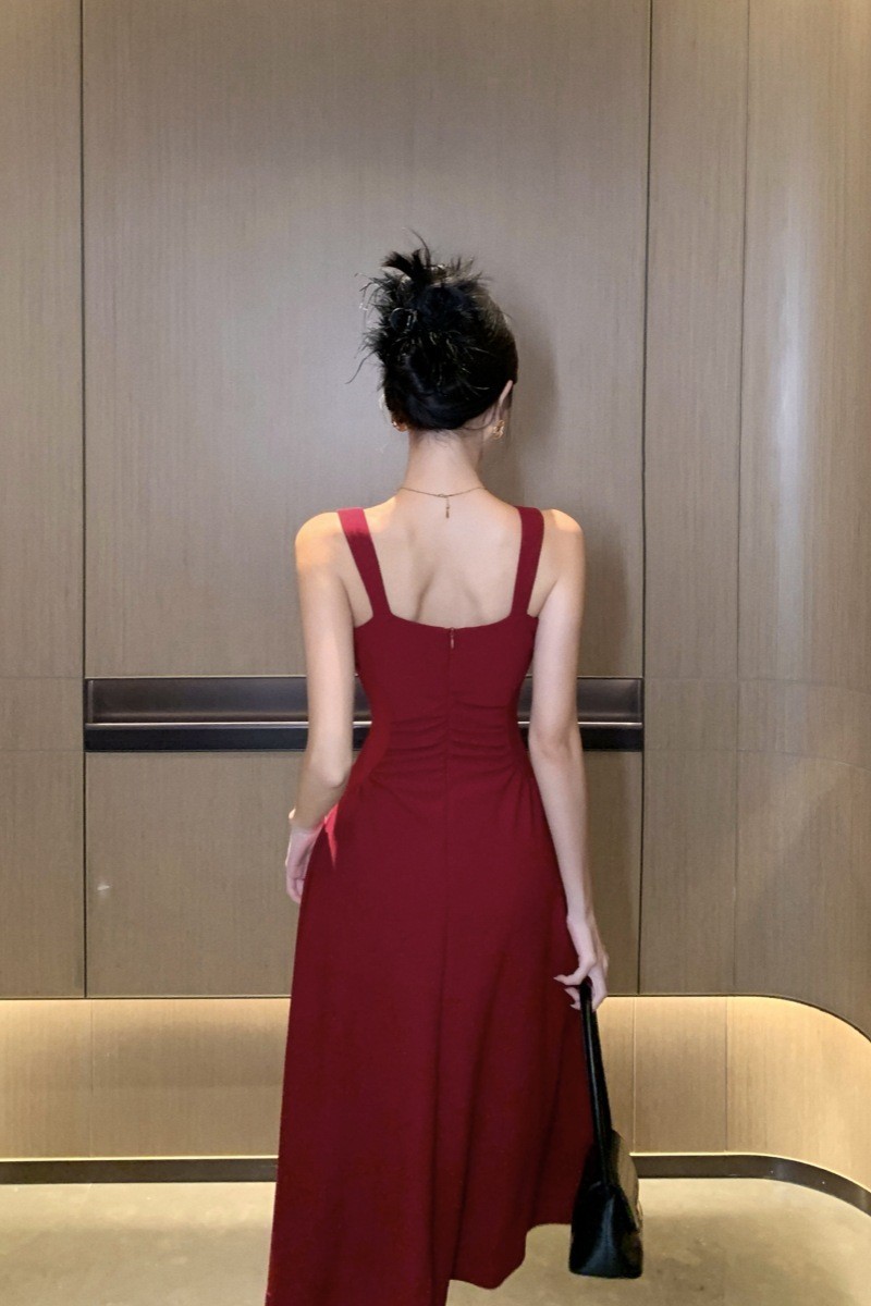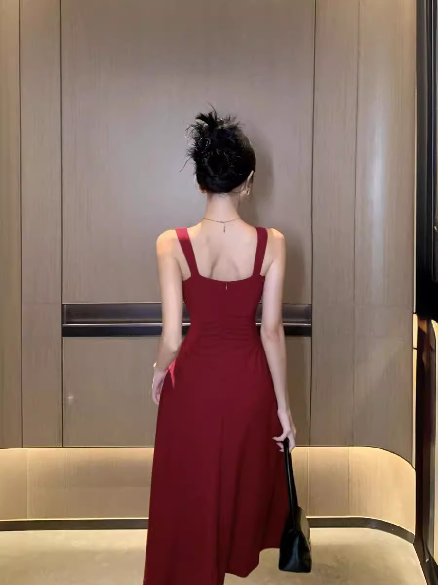 红色方领吊带连衣裙新款收腰显瘦日常可穿敬酒服订婚红裙子
