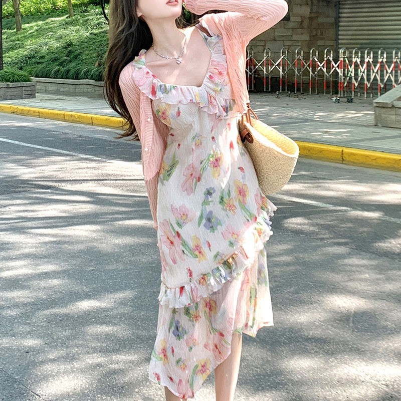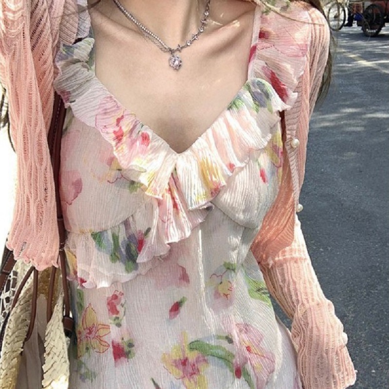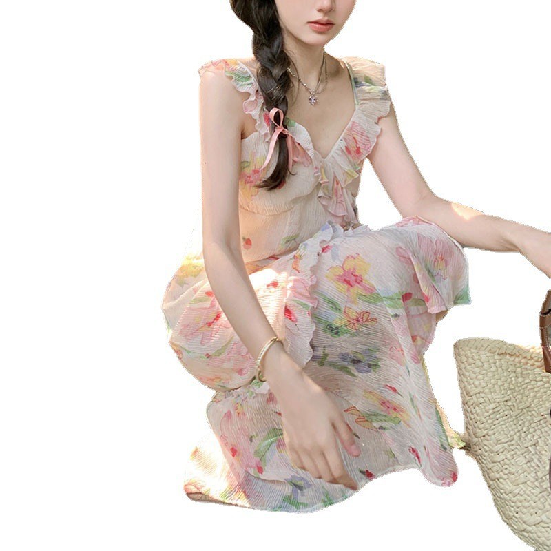 年夏季新款裙子名媛印花吊带裙女度假高级感木耳边雪纺连衣裙