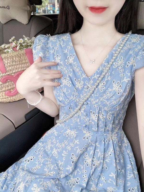 高级感重工刺绣蓝色桔梗法式连衣裙女夏季新款小个子收腰显瘦裙子