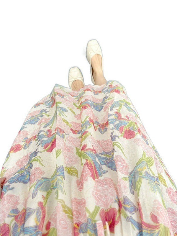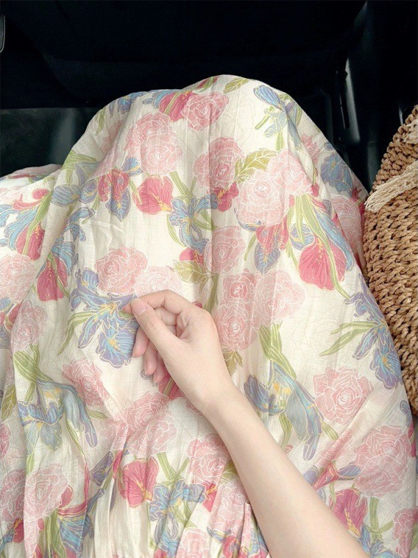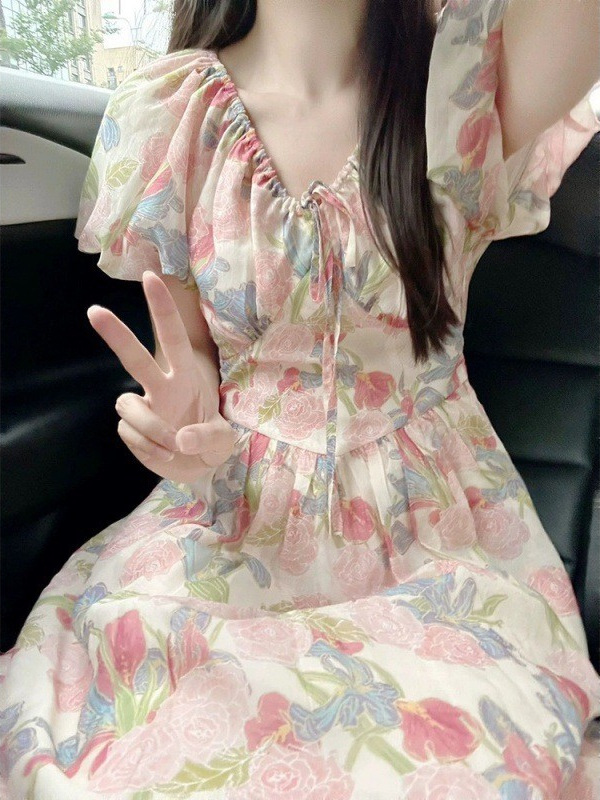 法式茶歇裙碎花v领泡泡袖连衣裙女夏季收腰显瘦长裙雪纺气质A子裙
