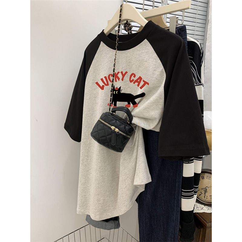 大码女装插肩短袖oversize宽松纯棉拼接设计感t恤夏季显瘦上衣ins