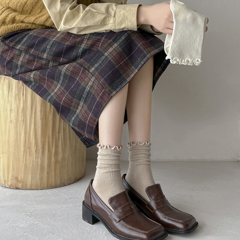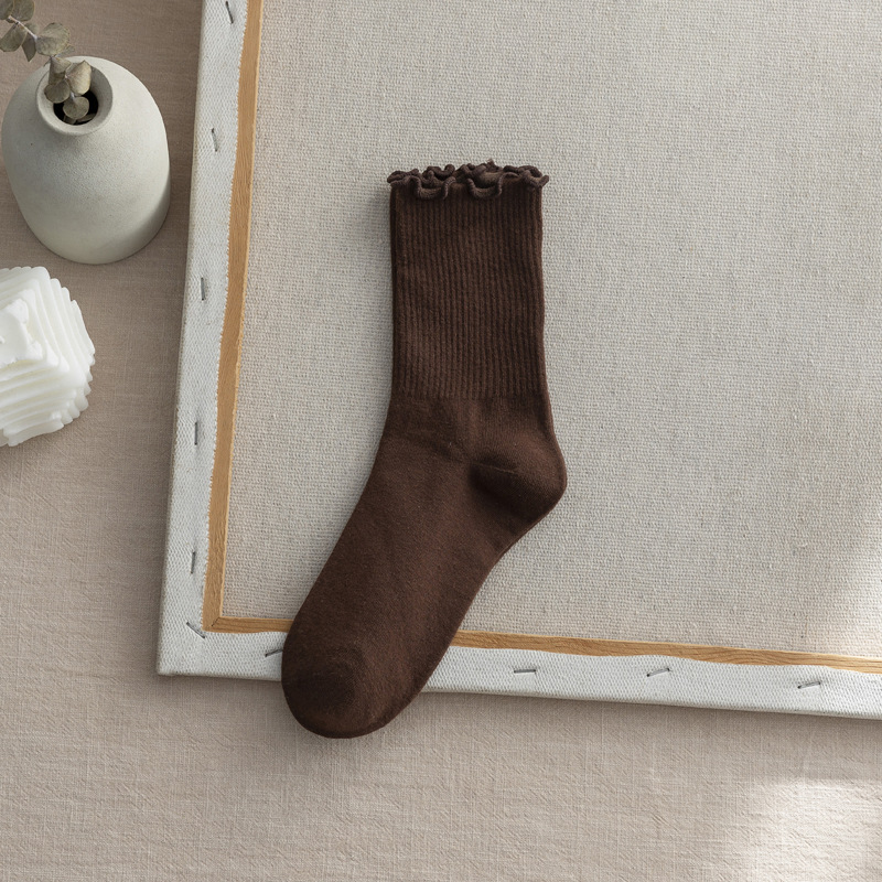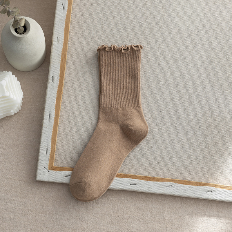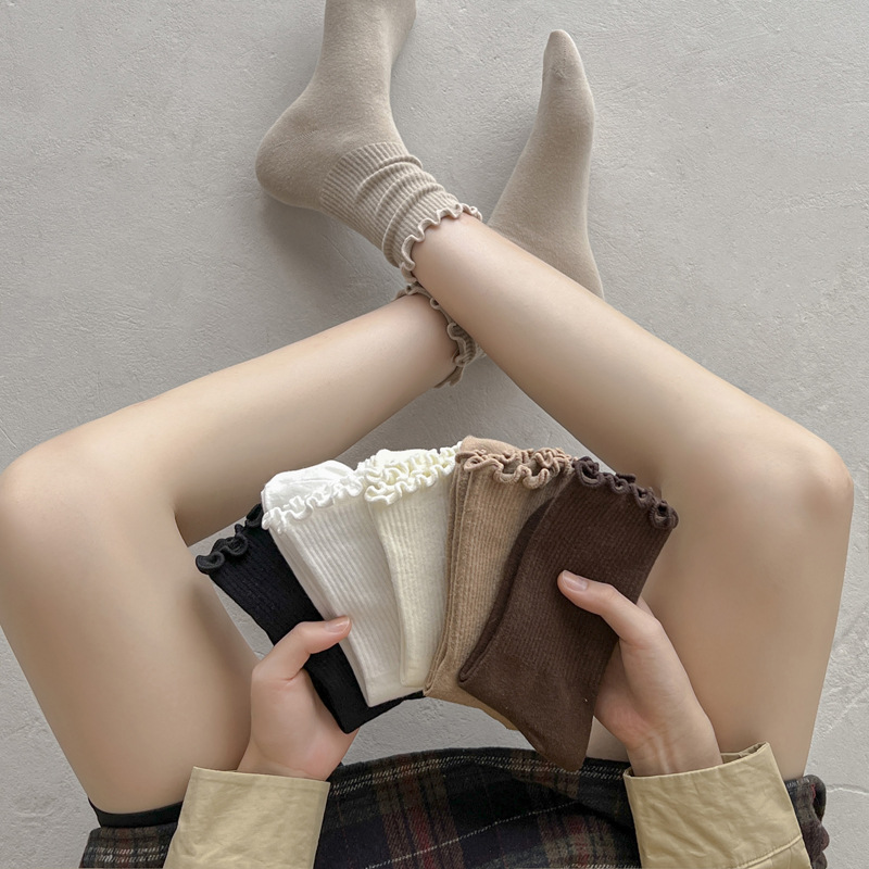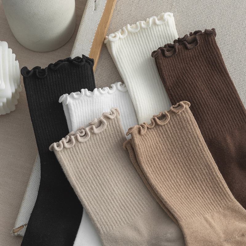 袜子女纯棉批发春夏新款木耳花边中筒袜纯色休闲条纹纯色jk堆堆袜