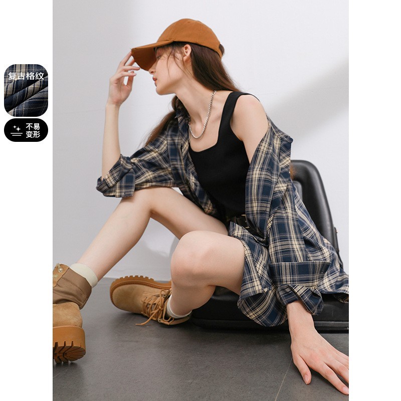 2025春夏季新款雅痞风衬衫宽松中长格子衬衣开衫上衣女夏薄