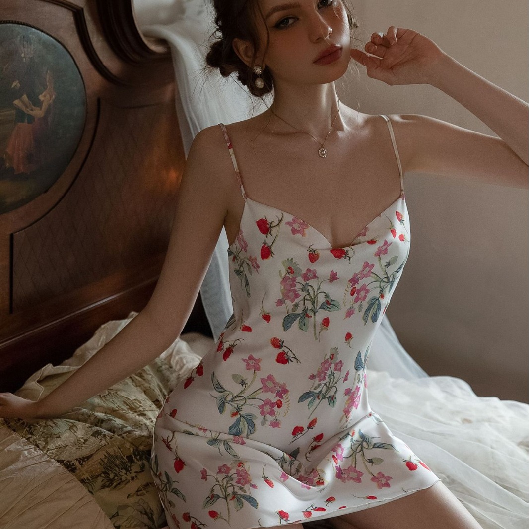 荡领性感睡衣冰丝印花仿真丝吊带睡裙女夏季新款可外穿