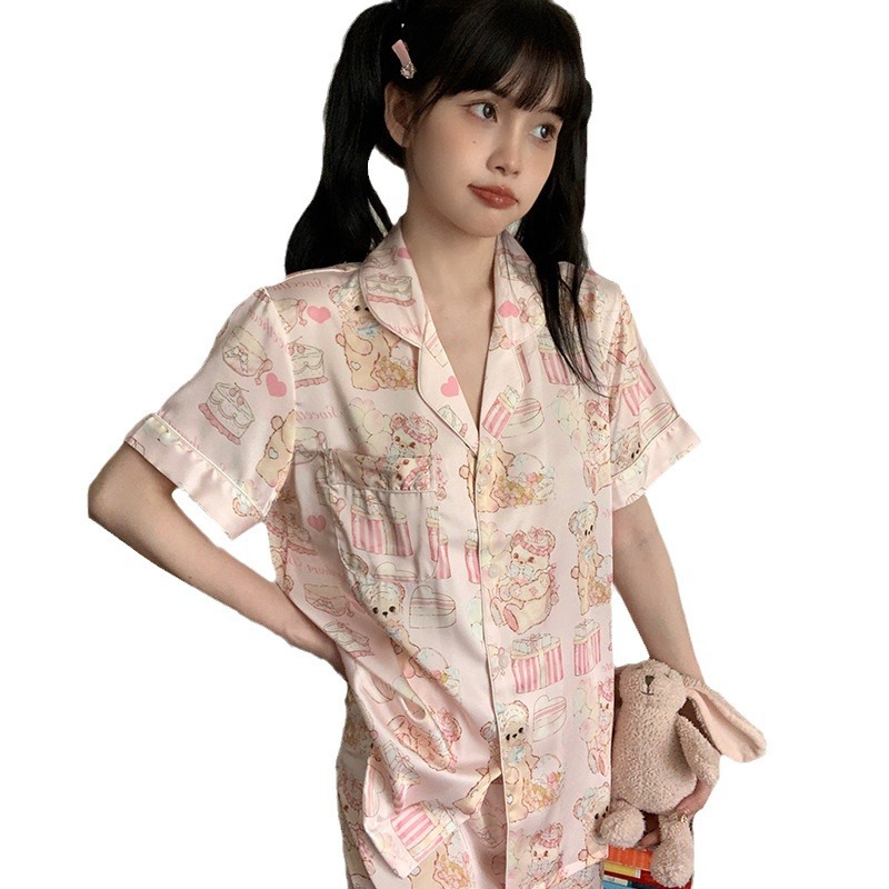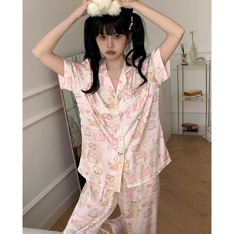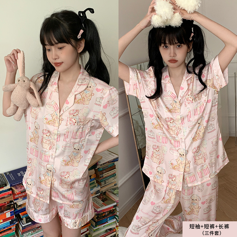 新款睡衣女冰丝夏短袖三件套丝绸【蛋糕熊】家居服套装可外穿