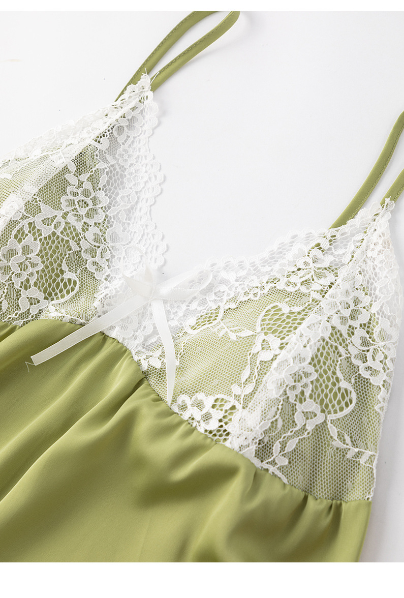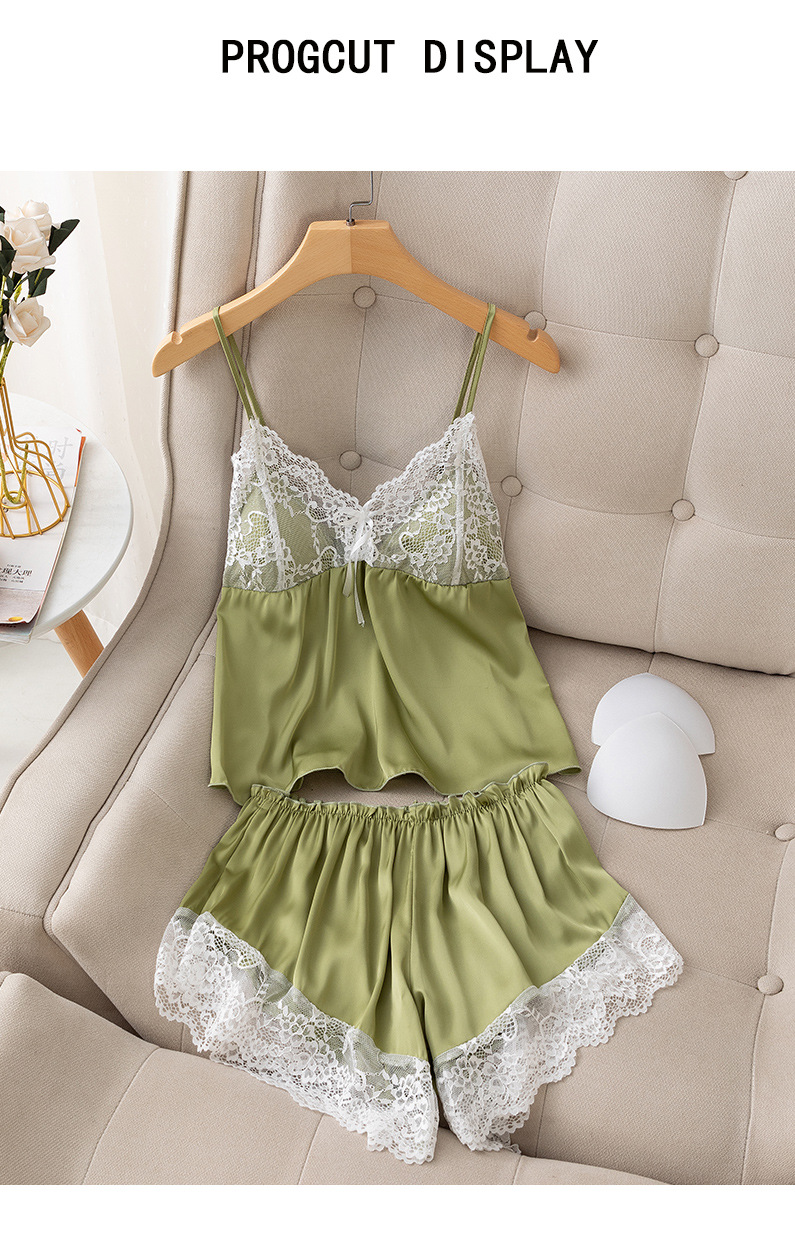 夏天睡衣女薄款冰丝绸吊带短裤两件套性感带胸垫蕾丝露背背心套装
