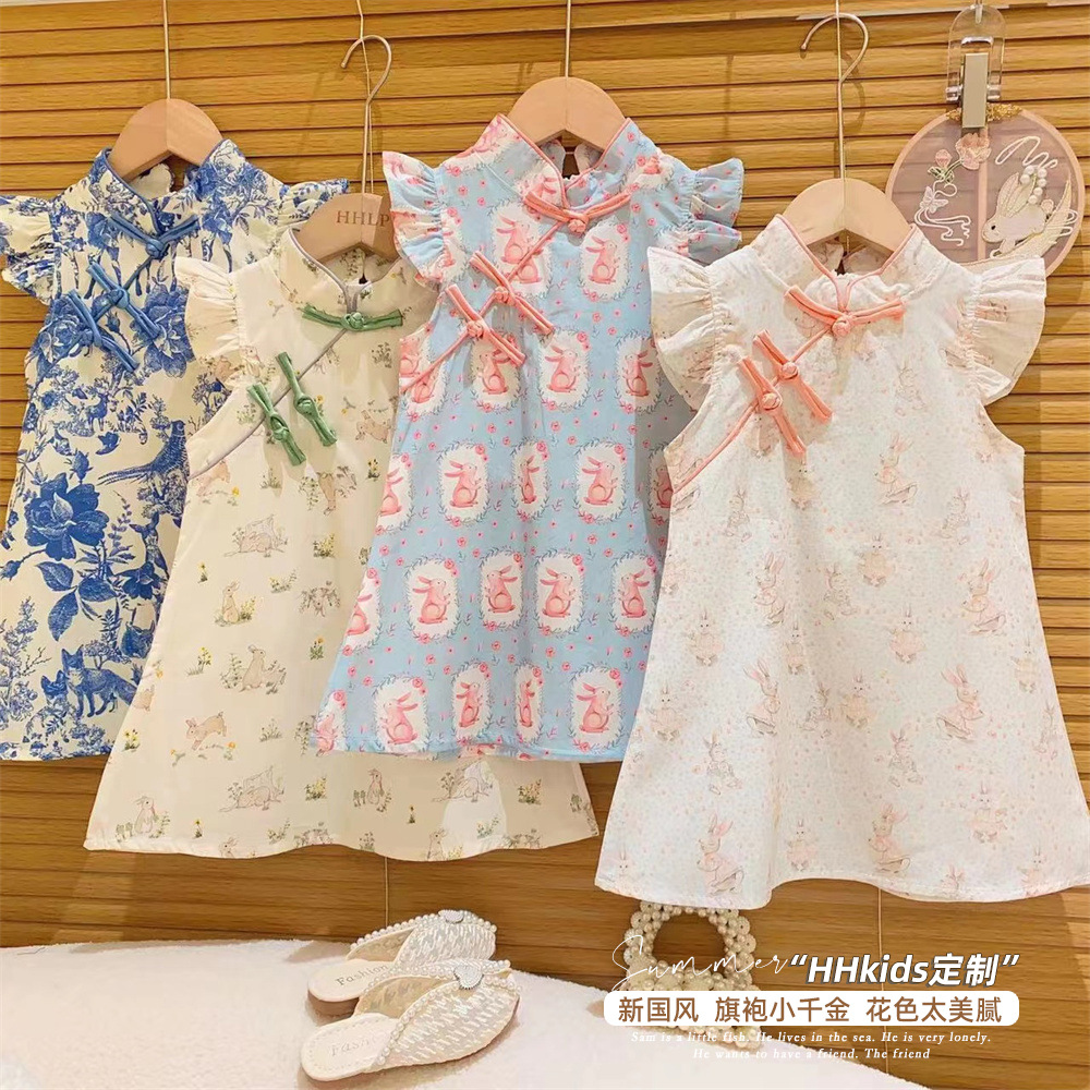 新品女童复古碎花小飞袖斜盘扣气质款公主旗袍裙2025夏装