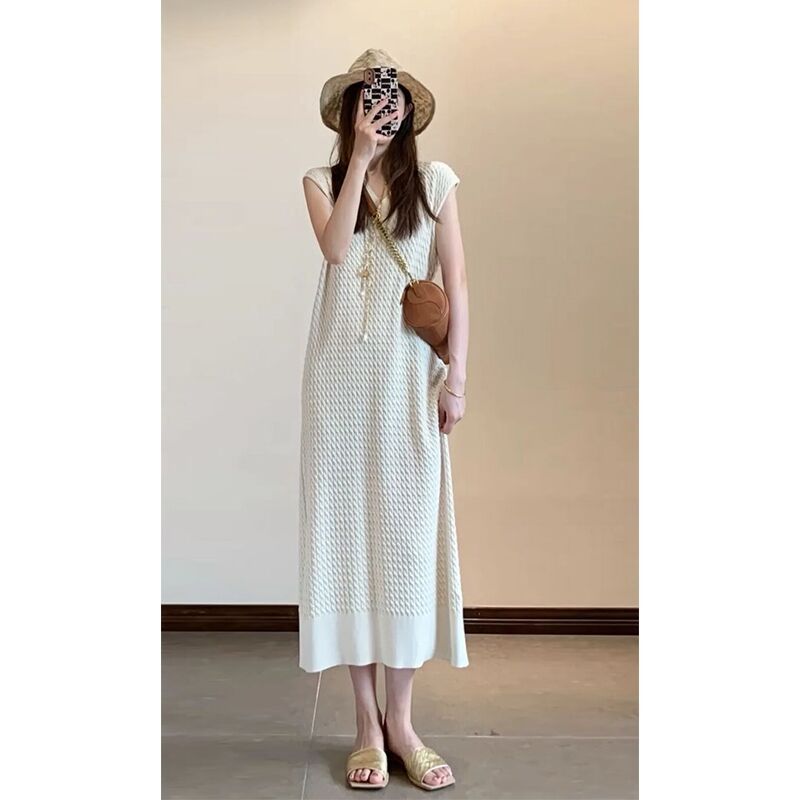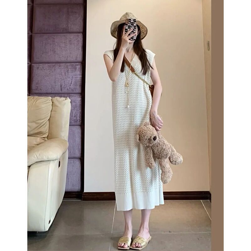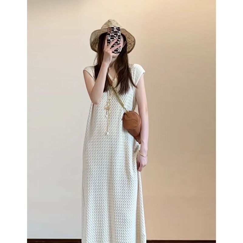 沙滩裙海边度假三亚气质梨形身材长款法式v领t恤针织连衣裙夏季女