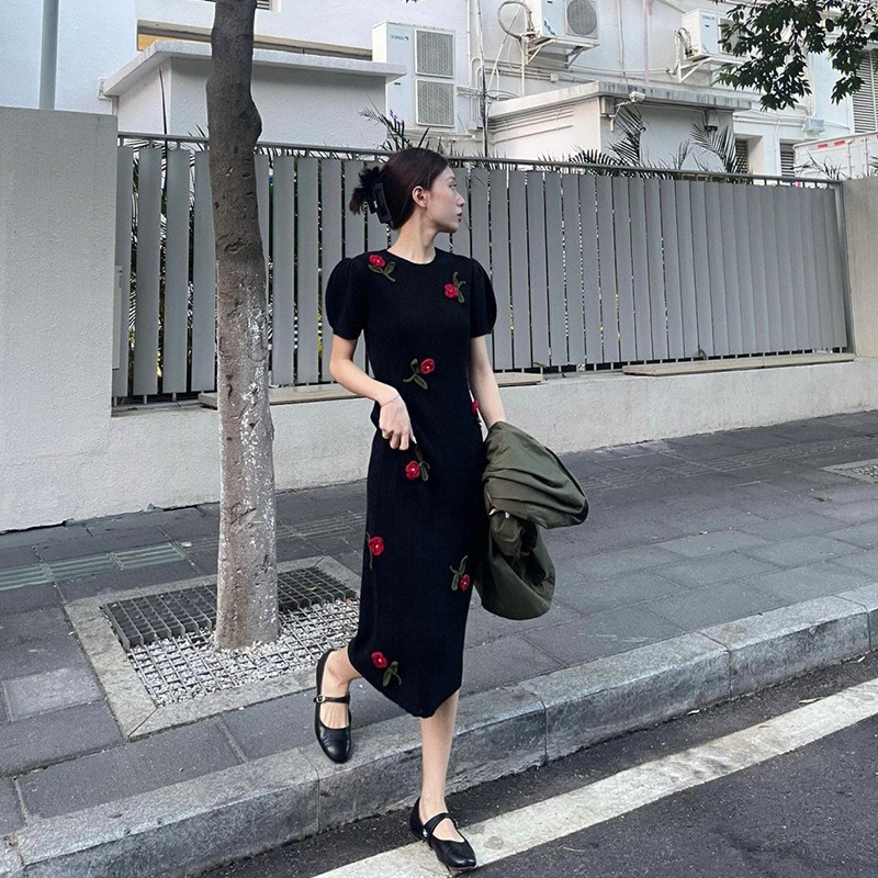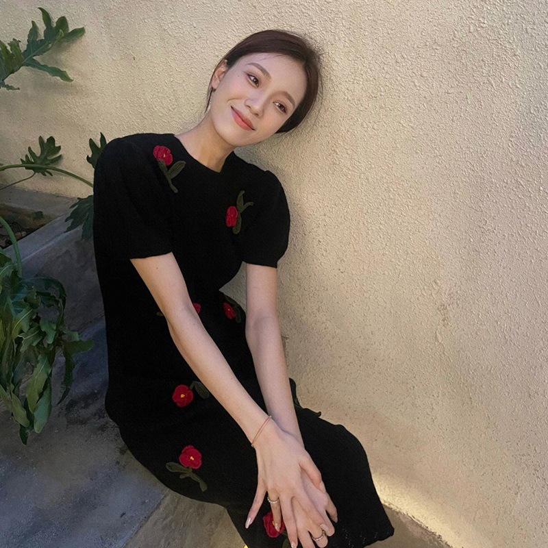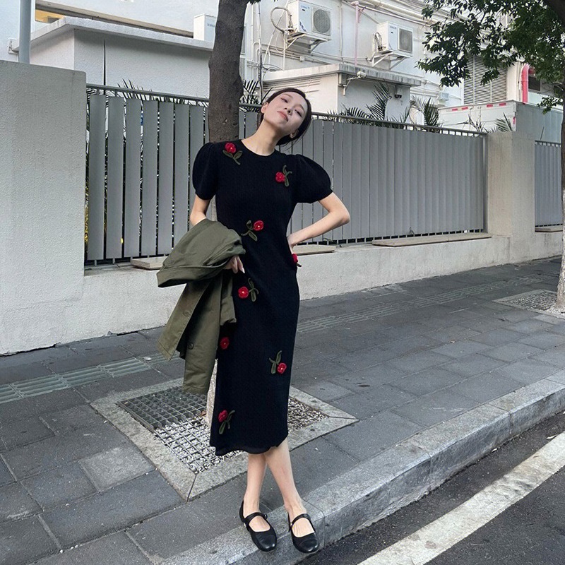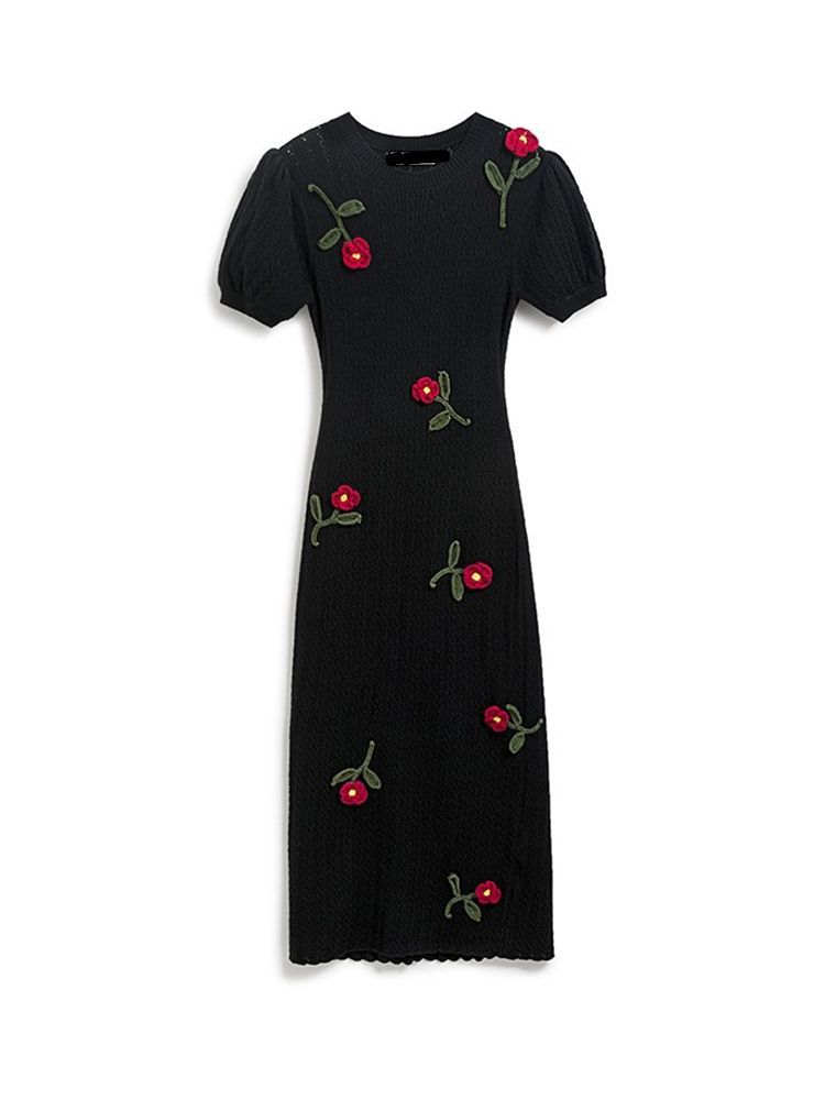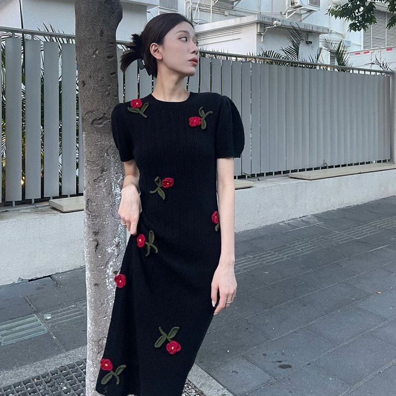 法式复古黑色连衣裙设计感小众立体撞色花朵修身显瘦泡泡袖针织裙