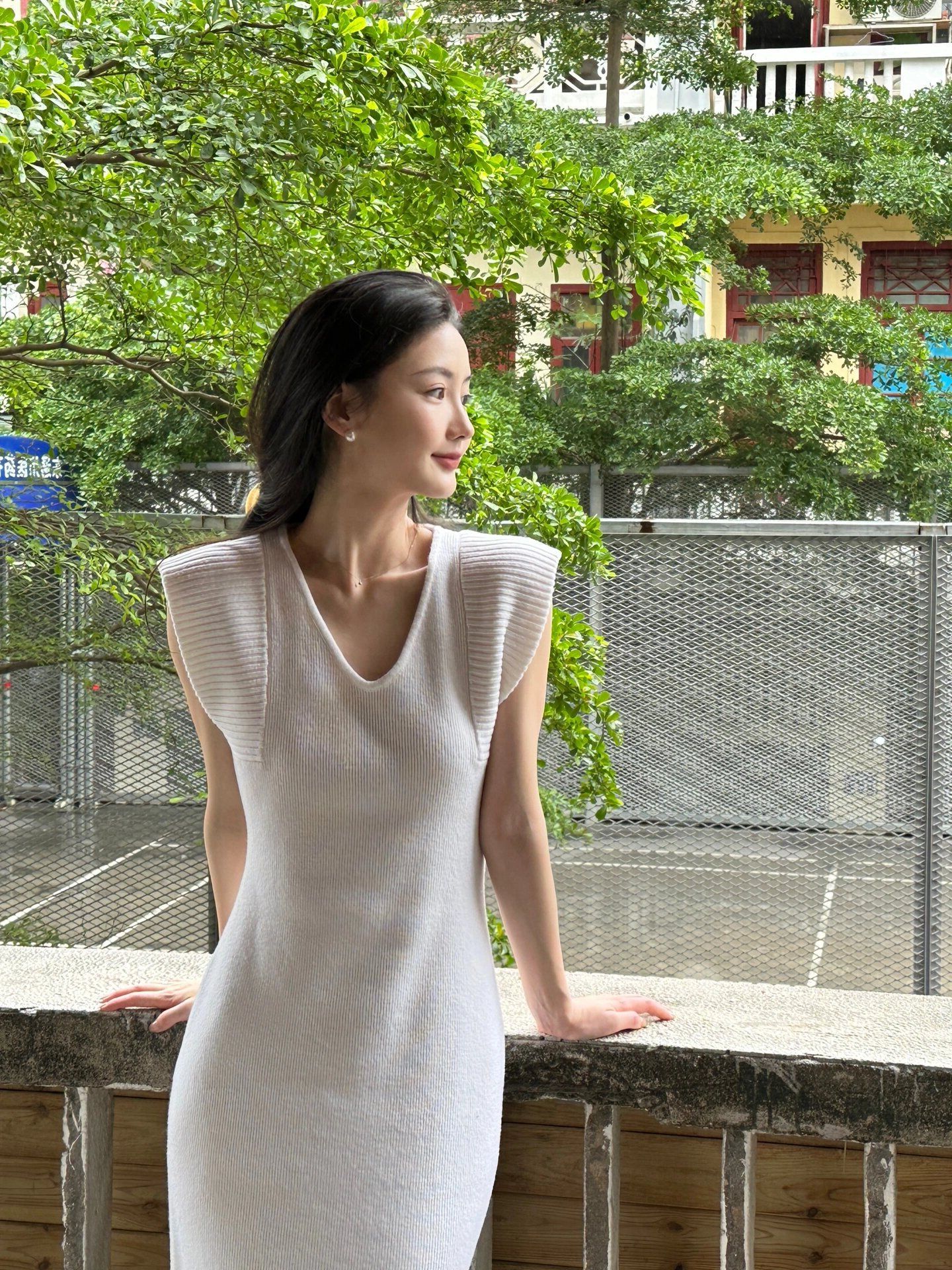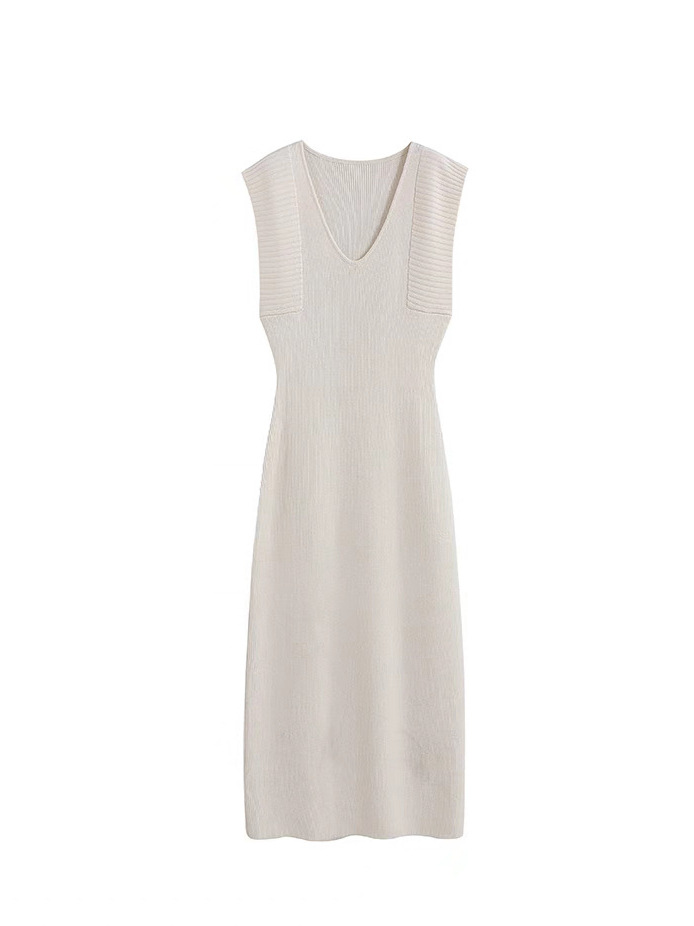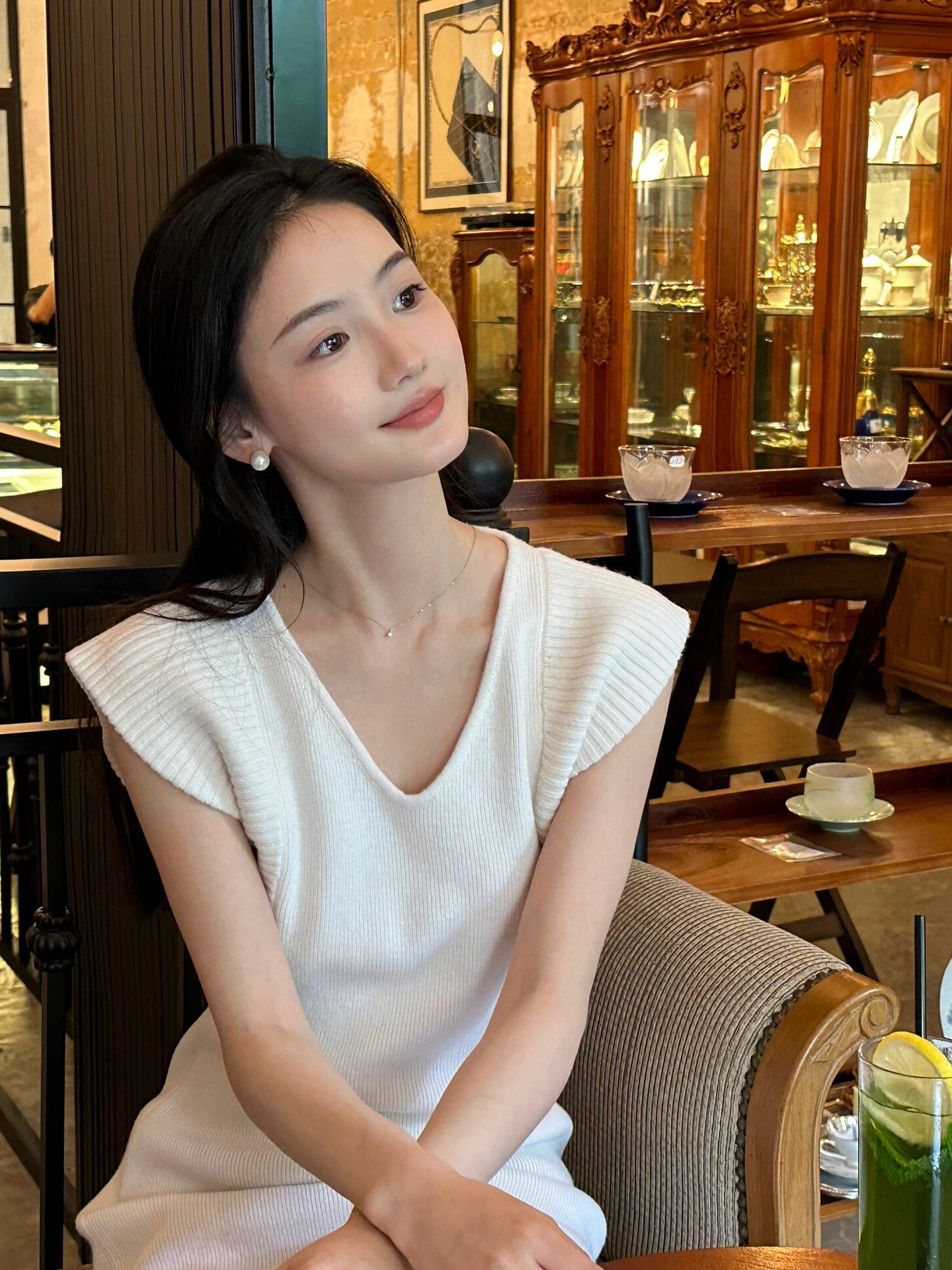 早春慵懒风白色V领飞飞袖针织连衣裙女法式松弛感修身收腰背心裙