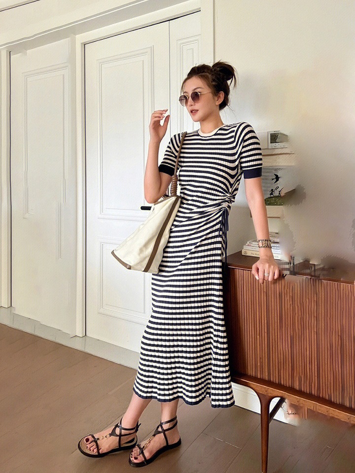 针织条纹抽绳短袖连衣裙轻熟御姐小众设计感收腰气质女神范高级感