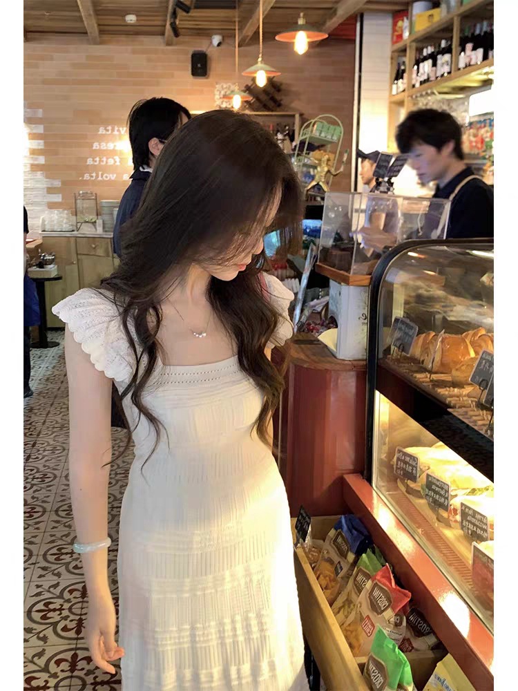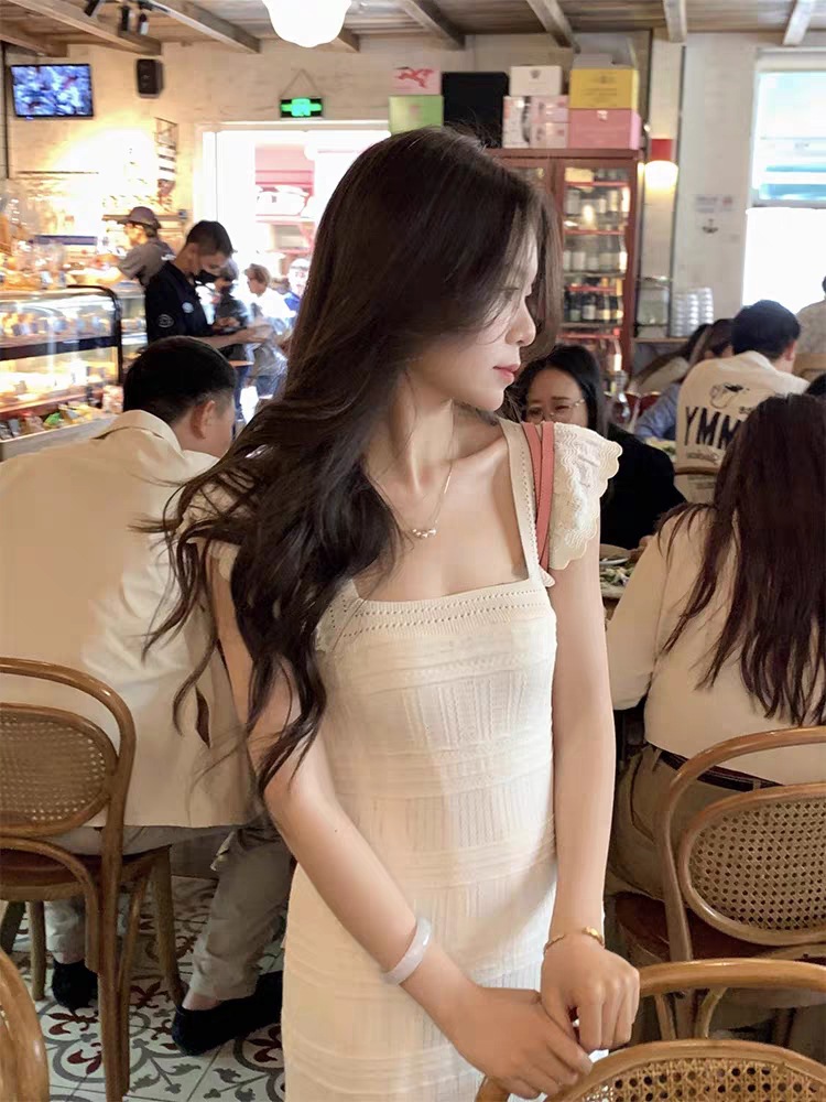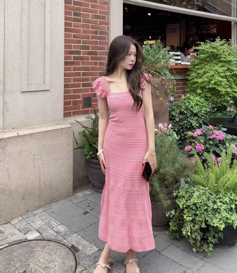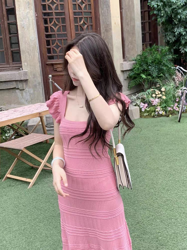 夏季名媛气质款法式长裙茶歇粉色修身温柔风小飞袖连衣裙子女神范