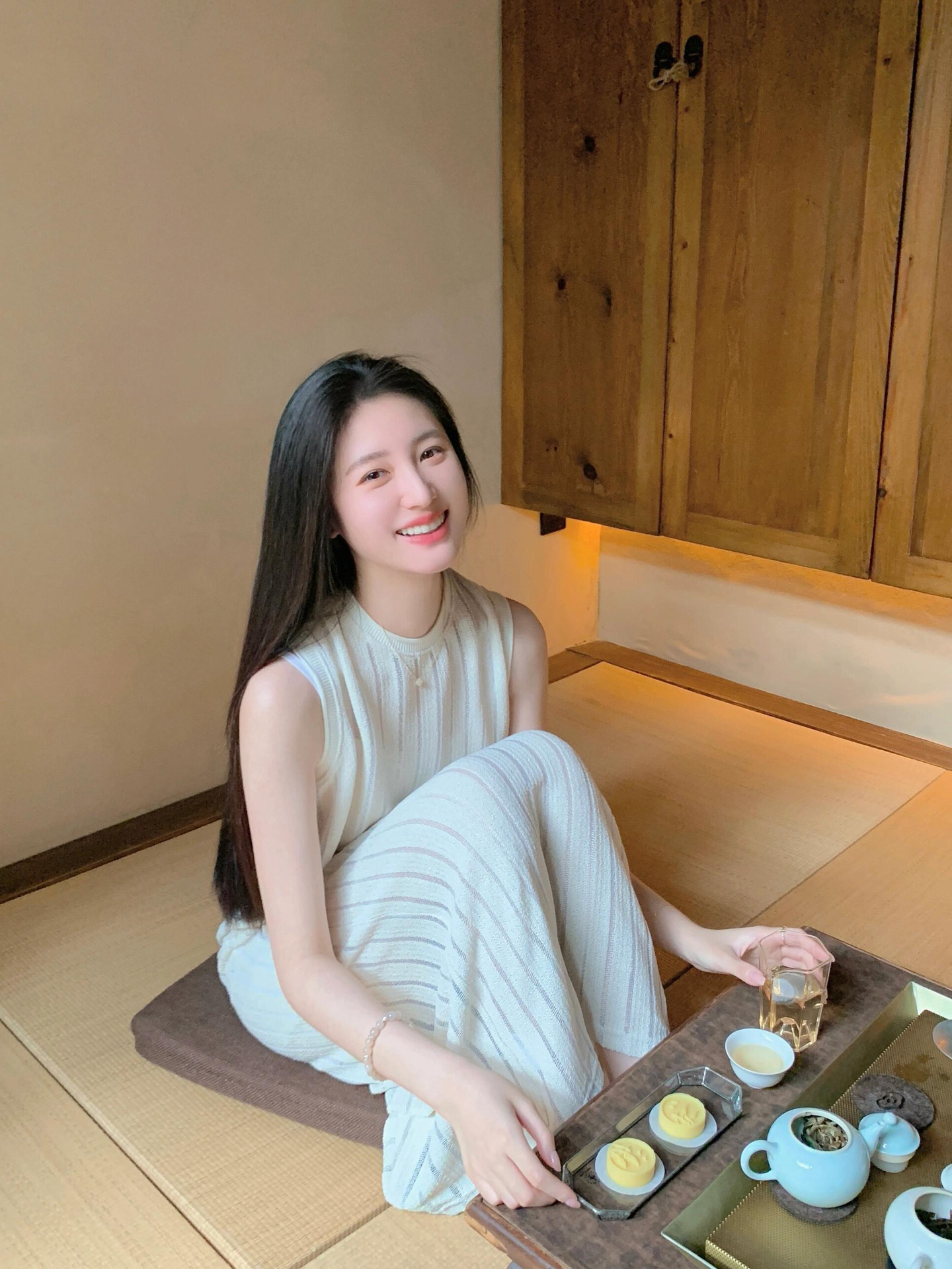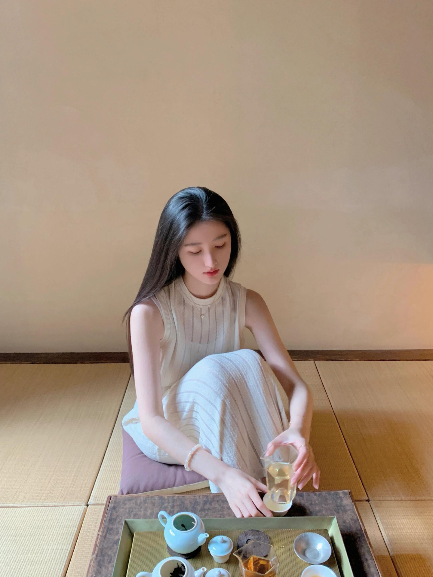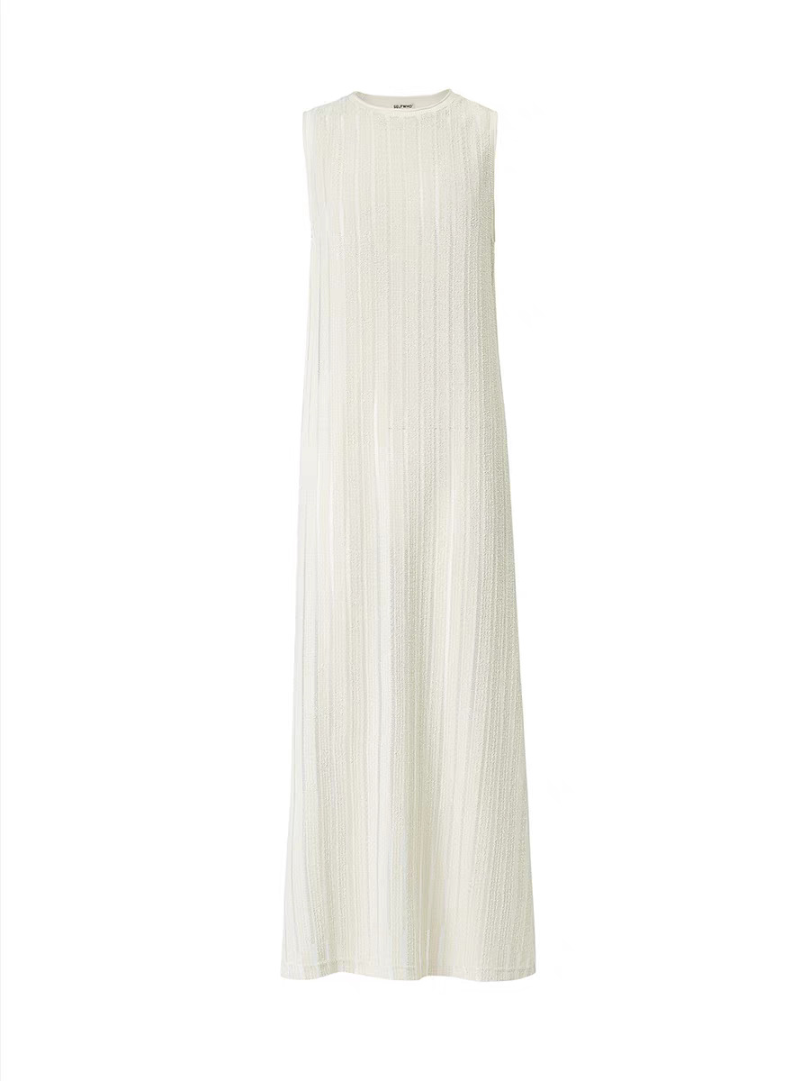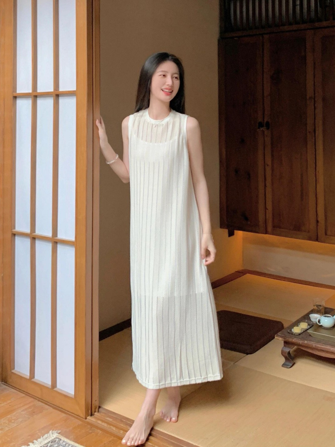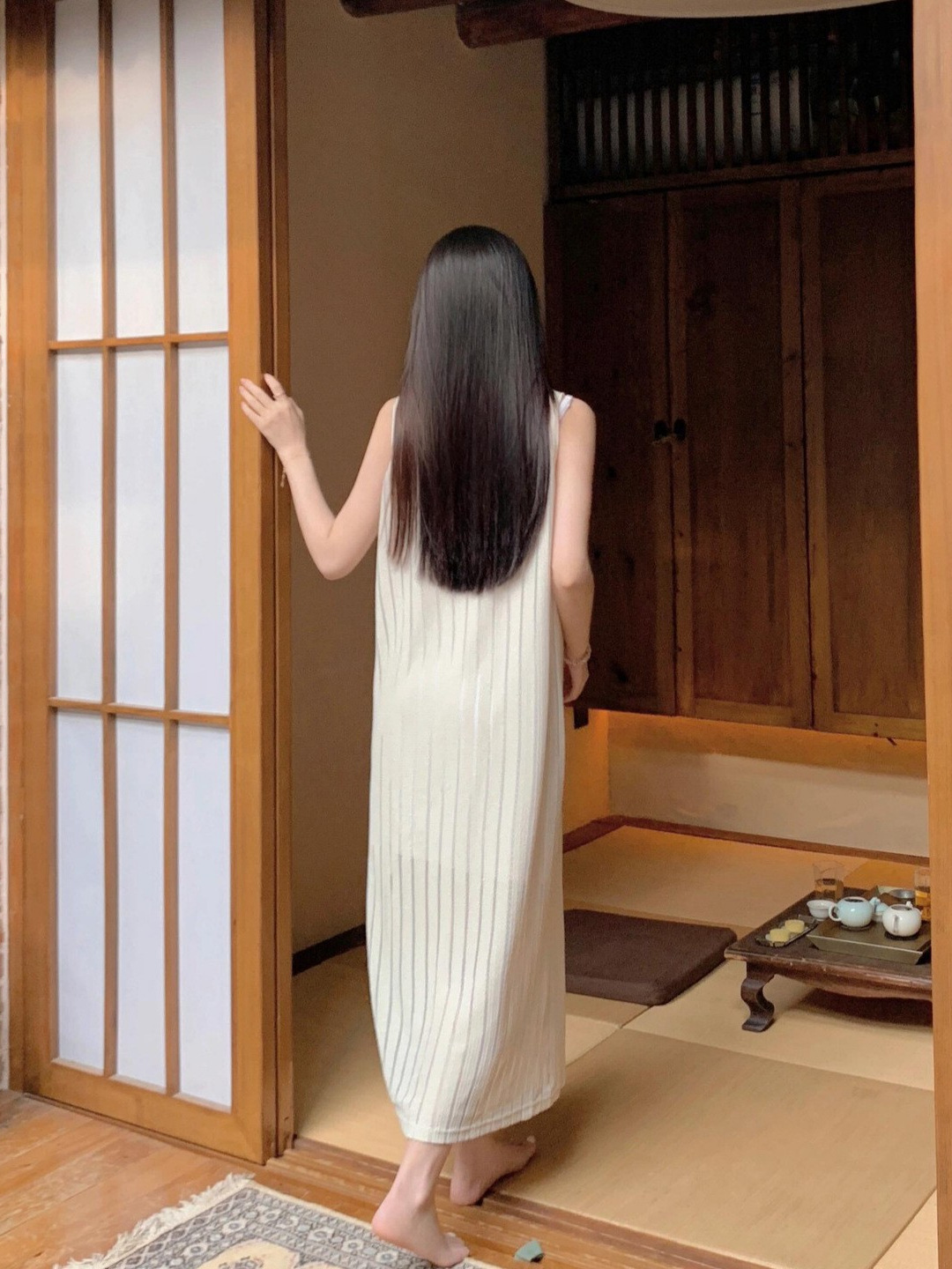 法式复古米白色镂空条纹吊带连衣裙夏季度假风宽松直筒无袖背心裙