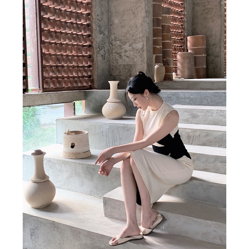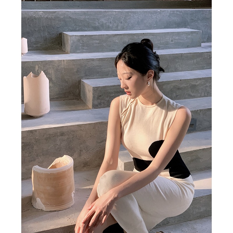 高级感圆领珍珠压褶裙摆针织背心连衣裙女气质温柔别致显瘦长裙子