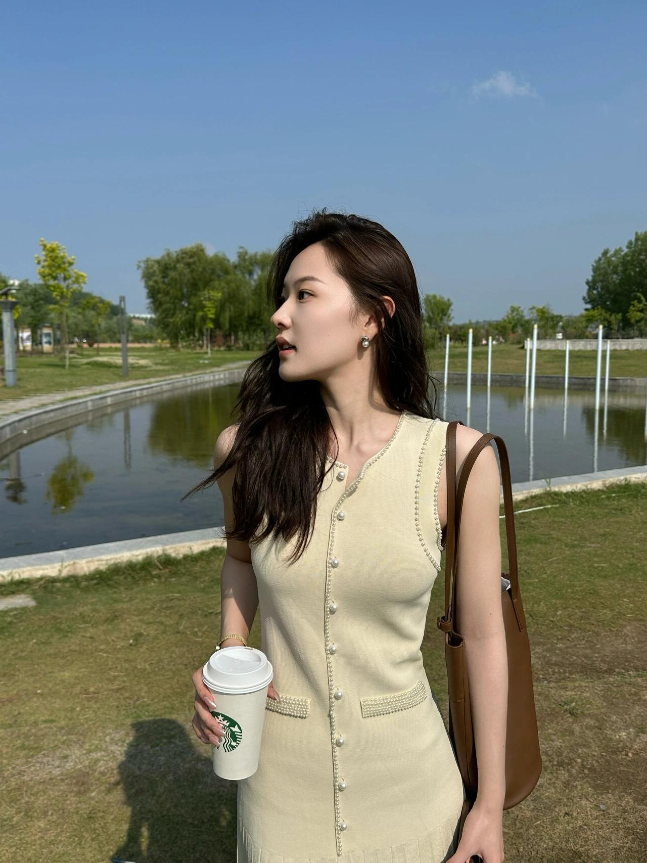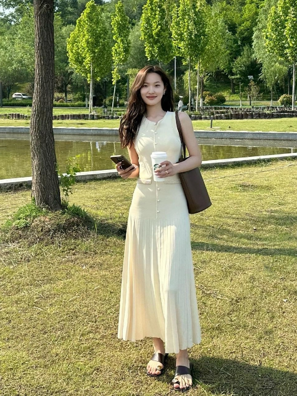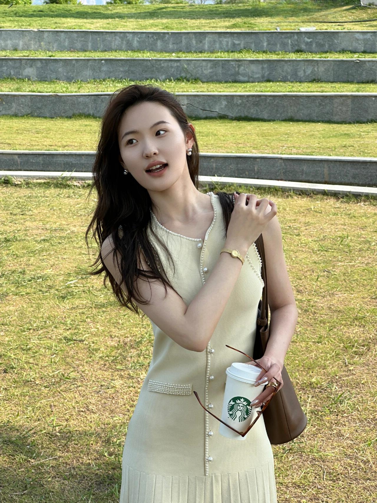 高级感圆领珍珠压褶裙摆针织背心连衣裙女气质温柔别致显瘦长裙子