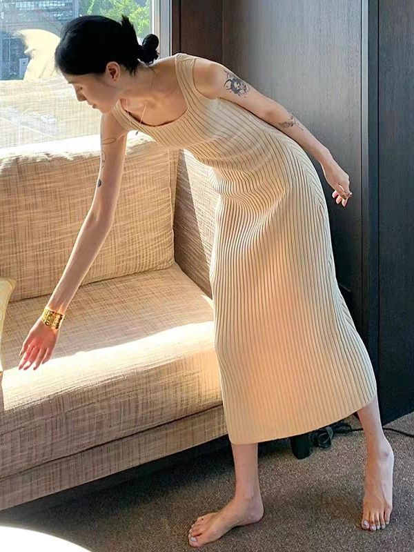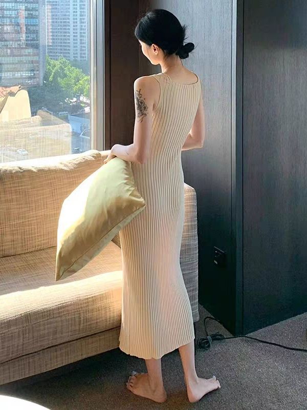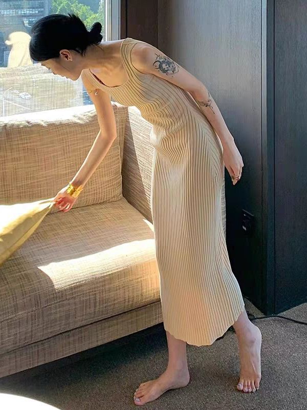 法式高级感杏色无袖内搭针织连衣裙女气质修身显瘦吊带背心长裙子