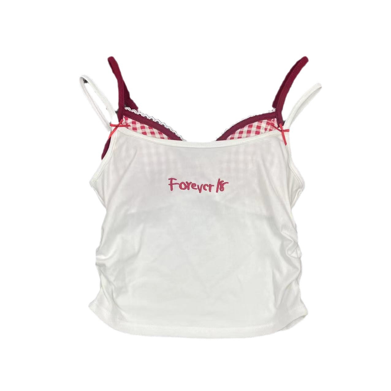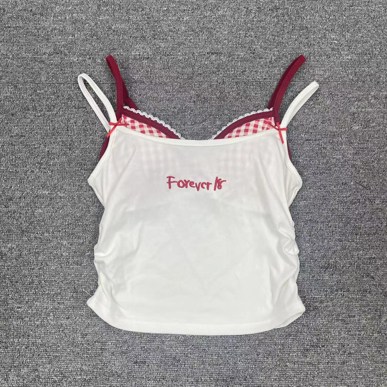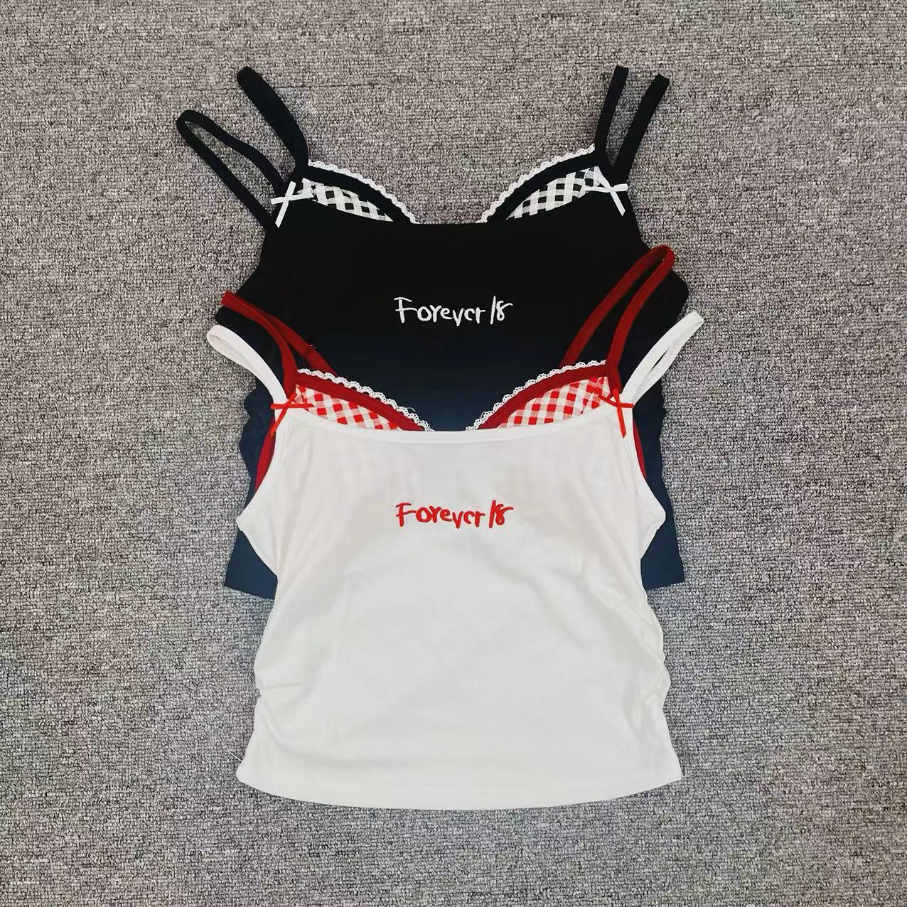 格子假两件美背吊带背心字母刺绣修身内搭裹胸外穿短款辣妹上衣潮