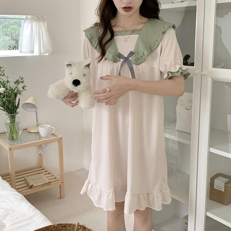 清新花边睡裙女夏季薄款棉质短袖夏天蝴蝶结宽松家居服连衣裙外穿