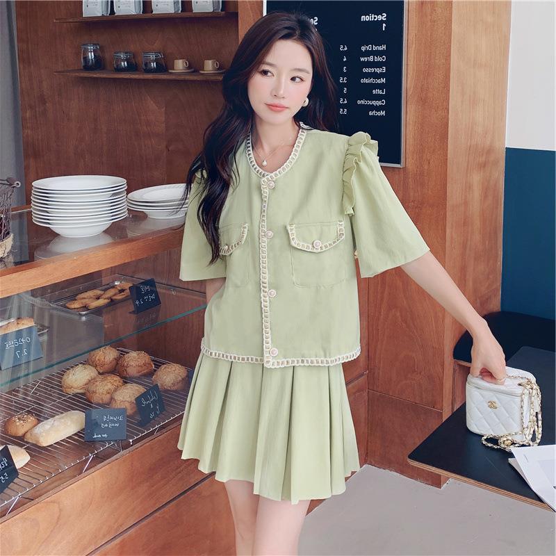 实拍别致单排扣荷叶边拼接短袖抹茶绿小香风上衣百褶半裙两件套女