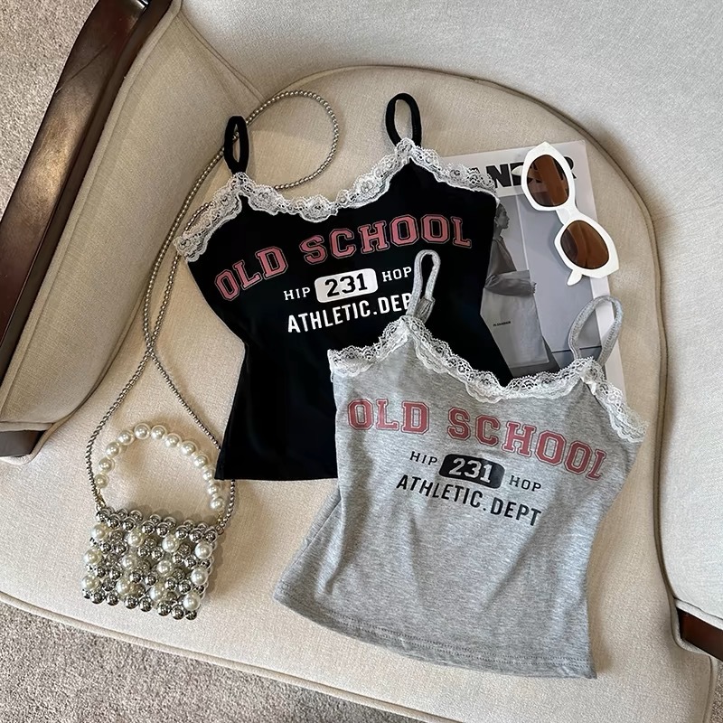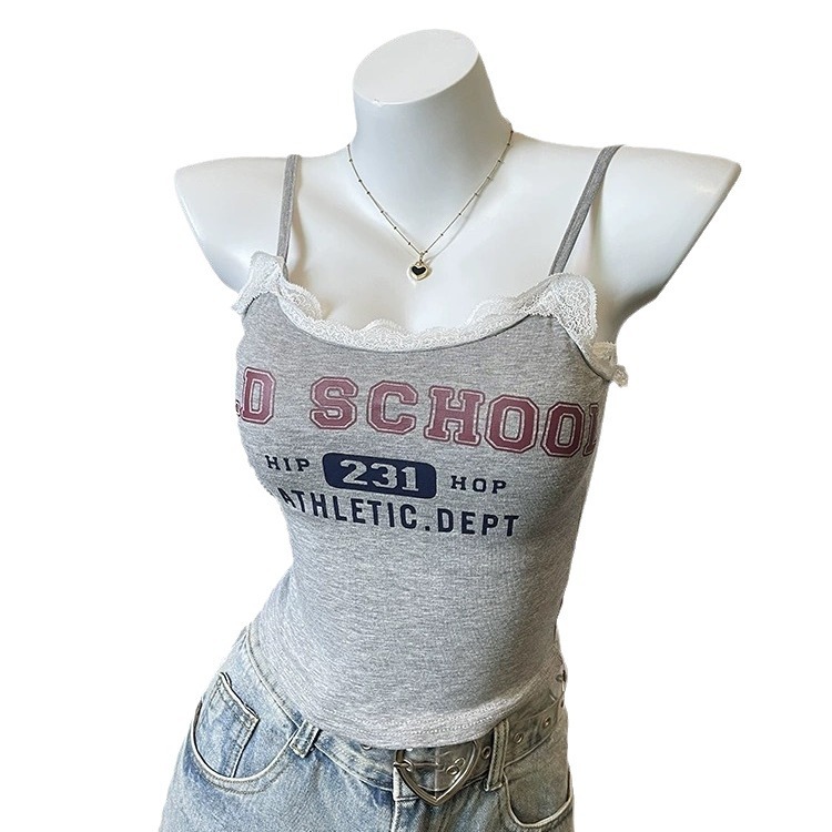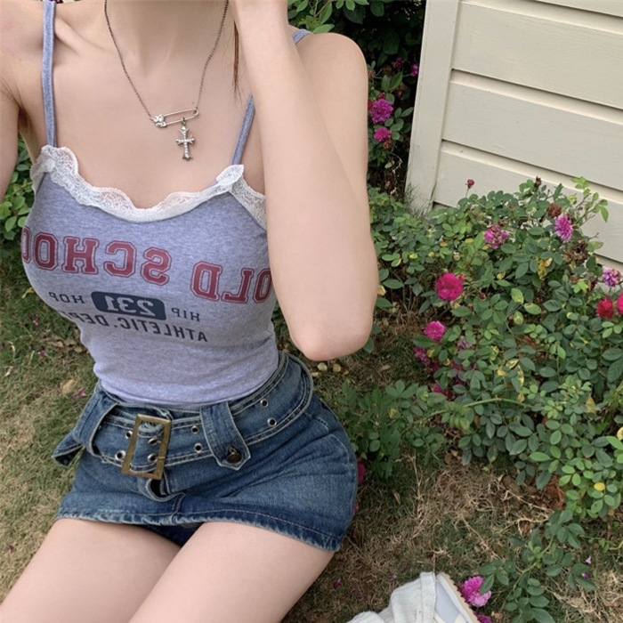 辣妹短款字母印花美背裹胸性感蕾丝边吊带背心外穿修身显瘦上衣潮