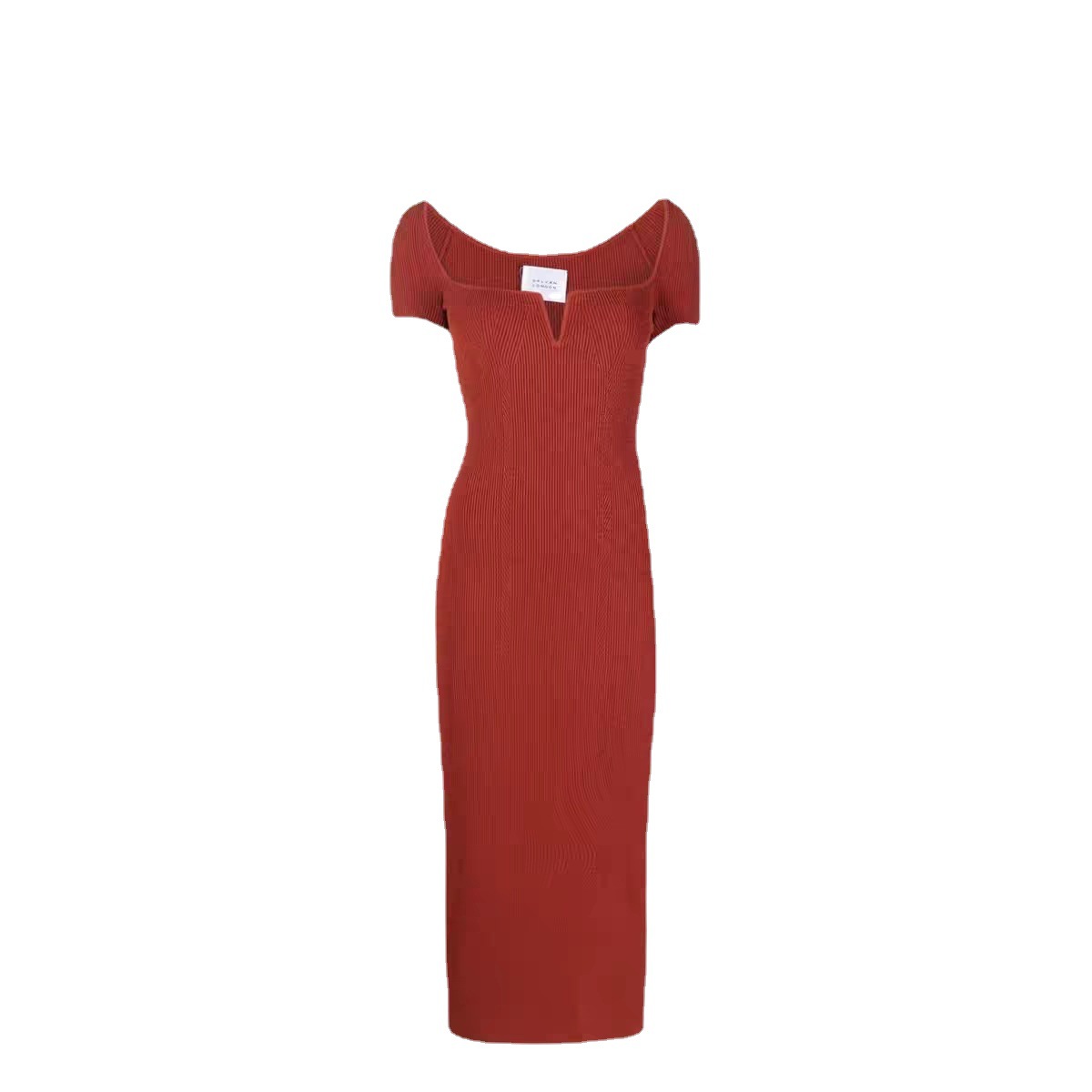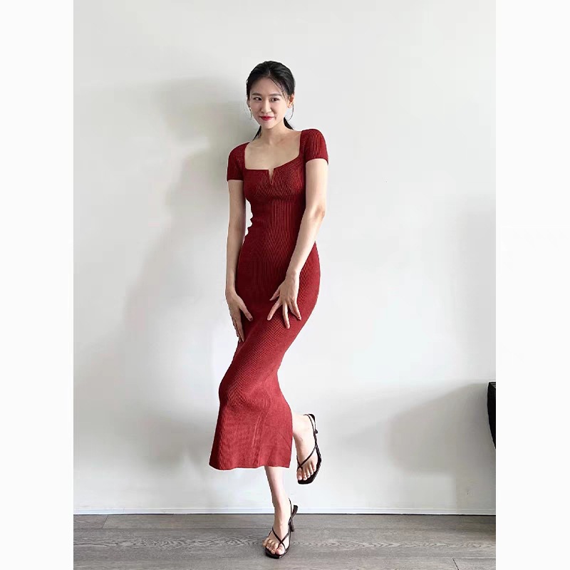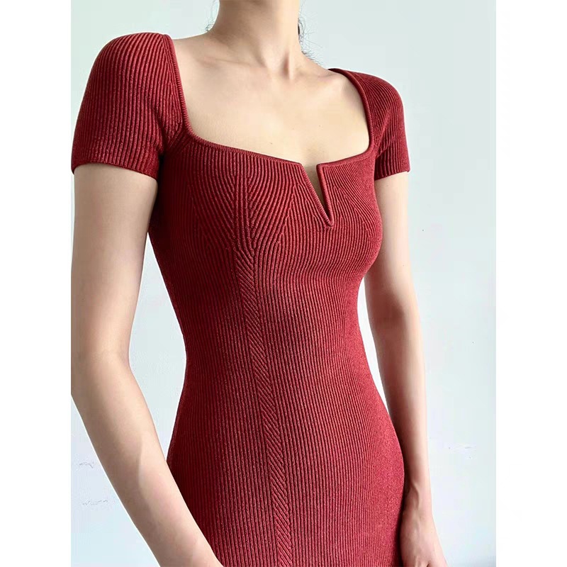 高级感酒红色敬酒服方领针织连衣裙小众设计修身显瘦显身材包臀裙
