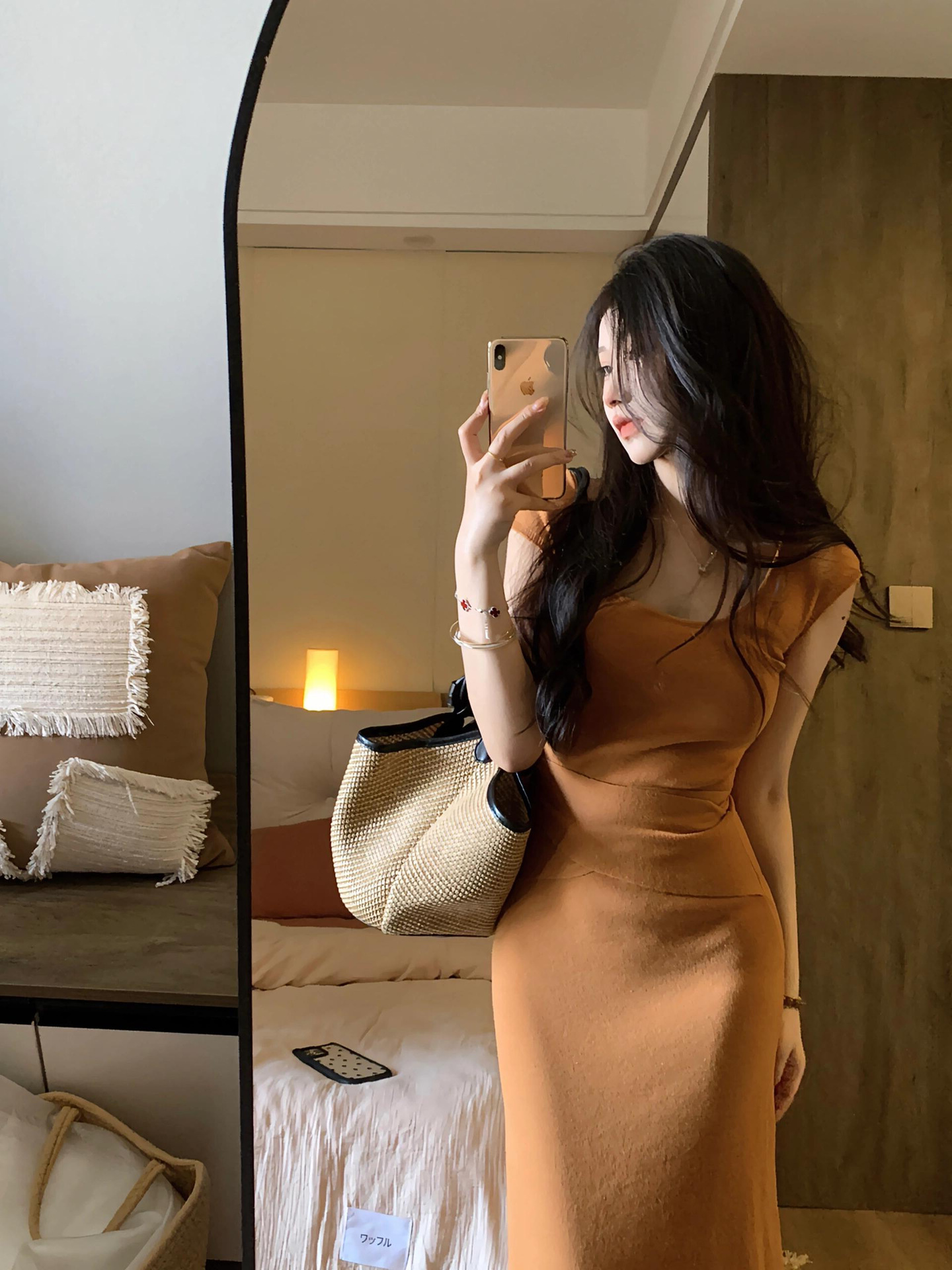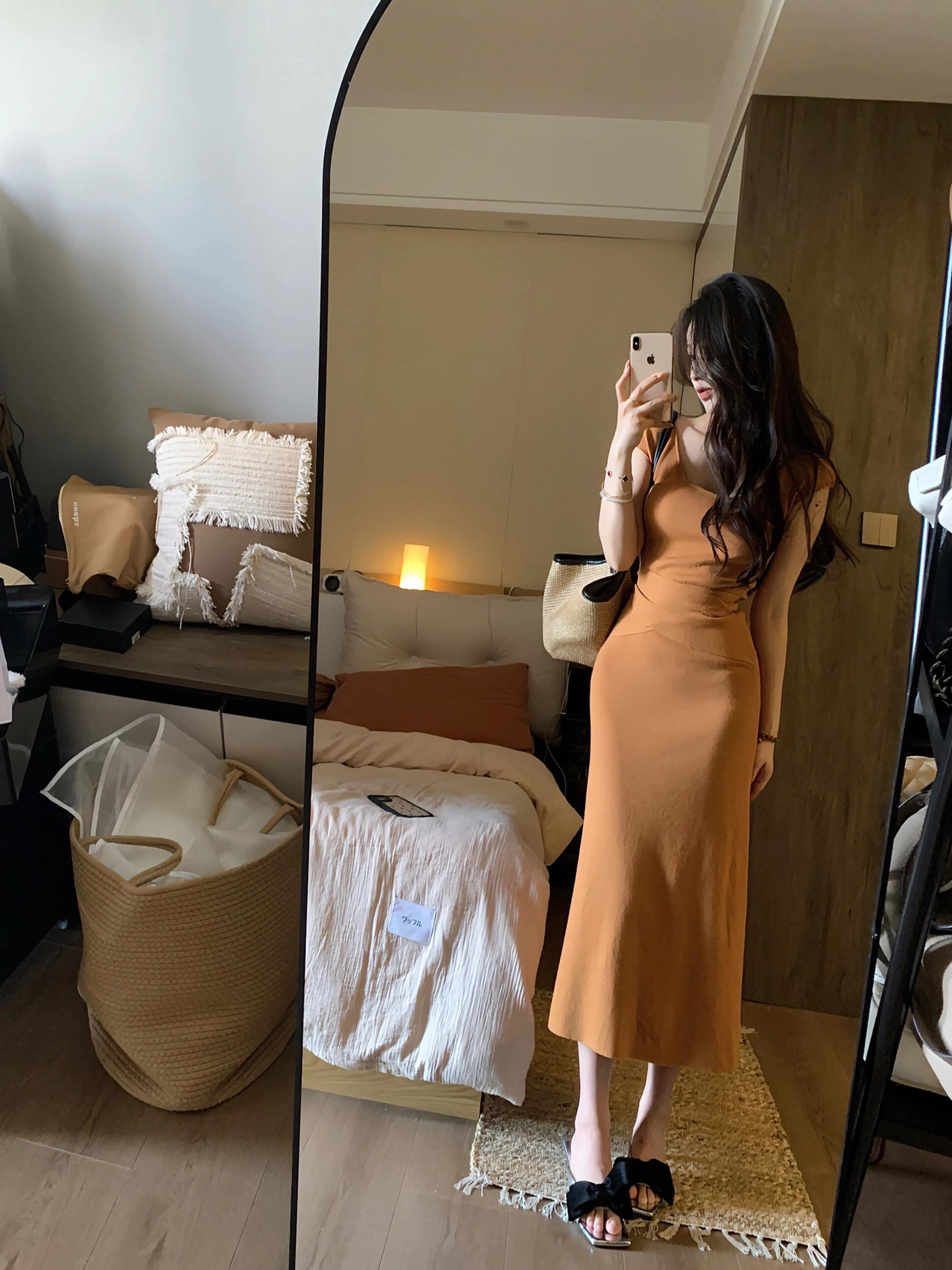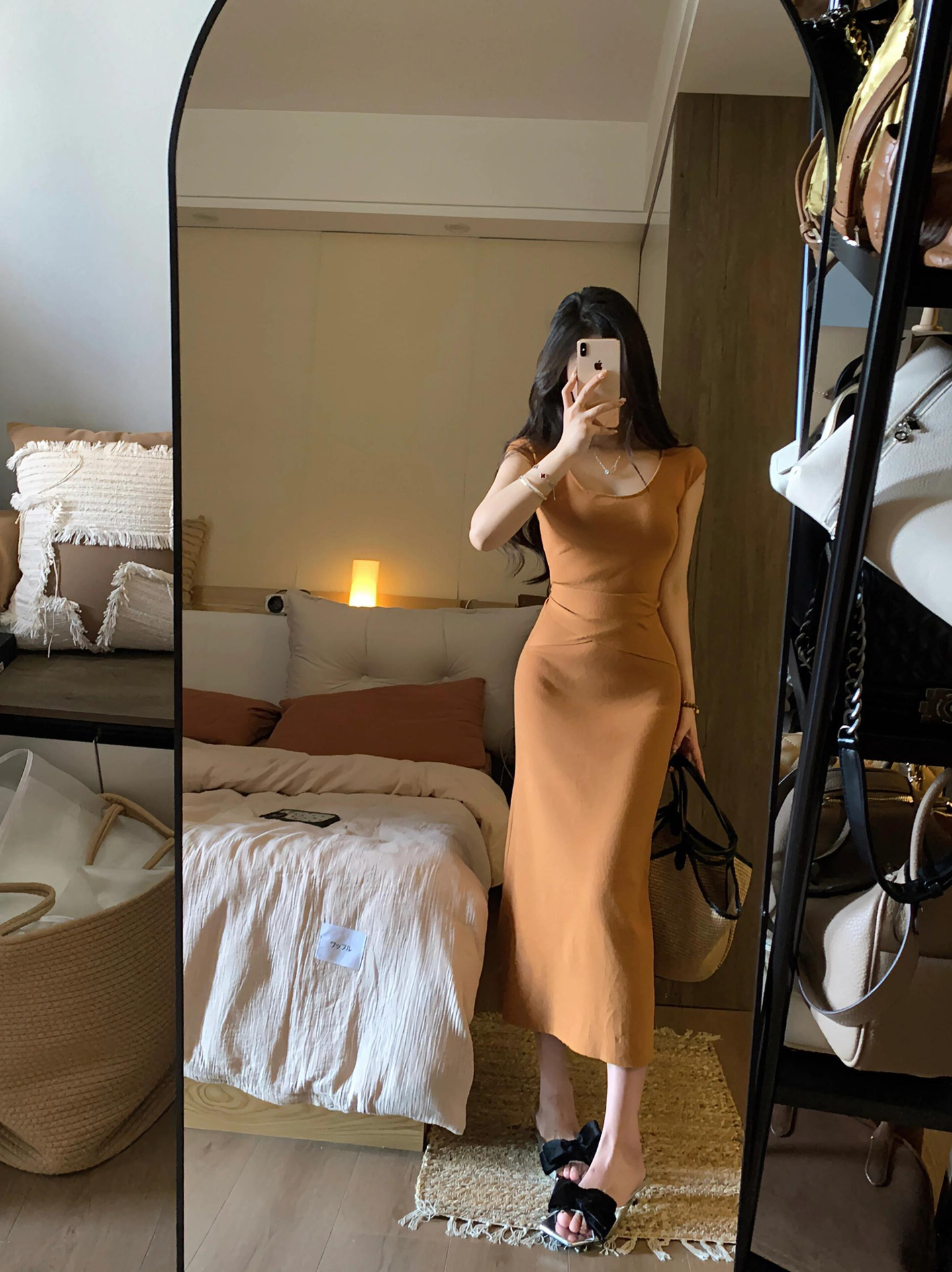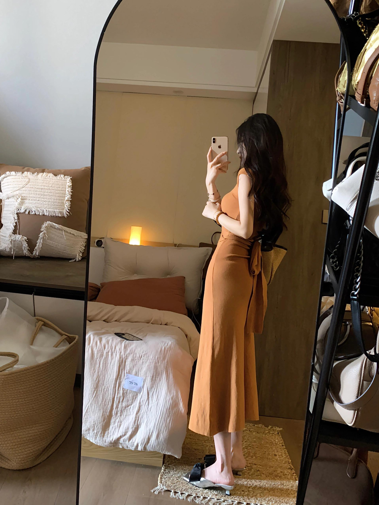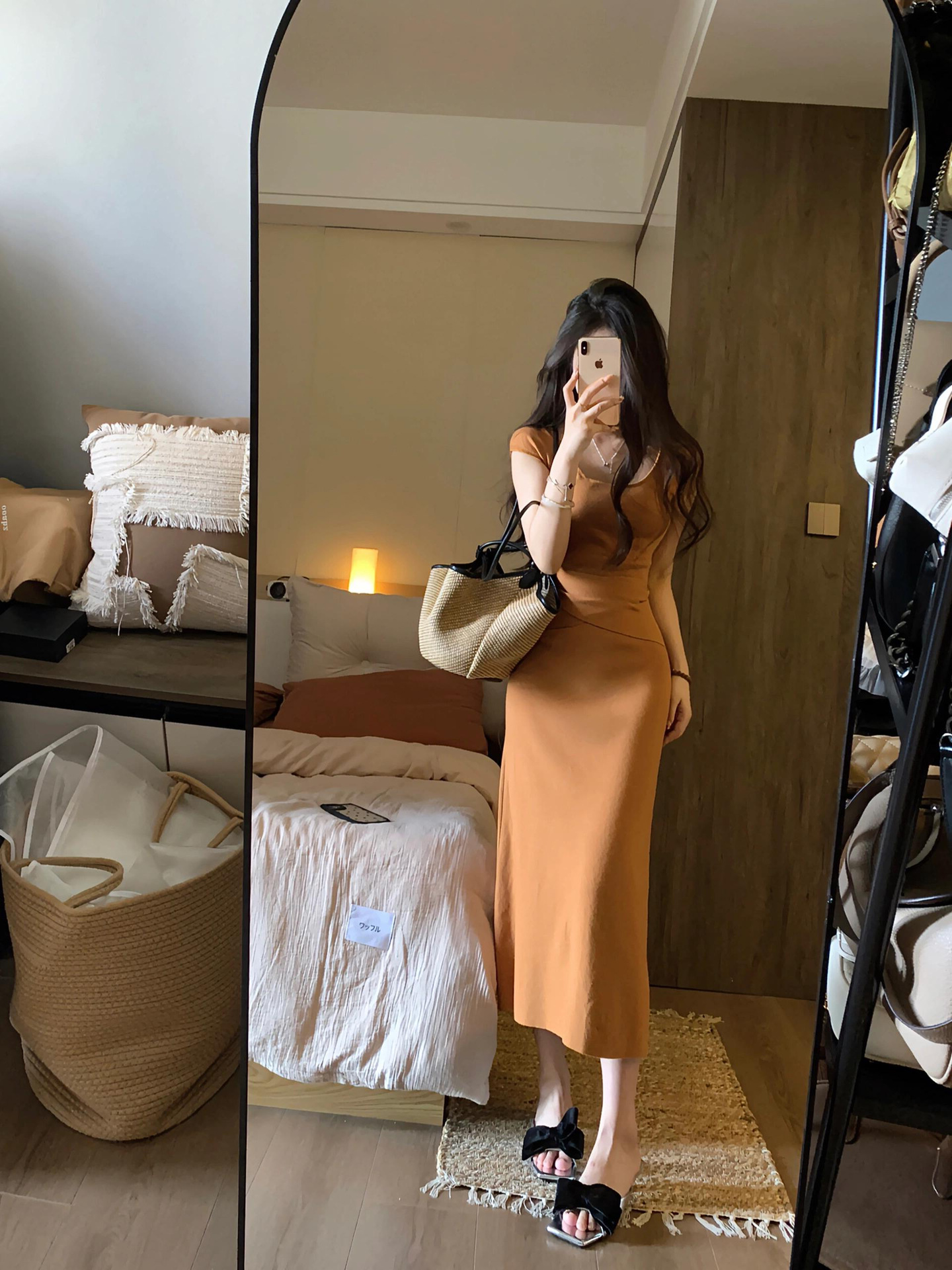 橘色圆领短袖针织绑带连衣裙法式度假风慵懒修身收腰简约长款裙子