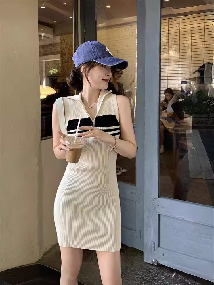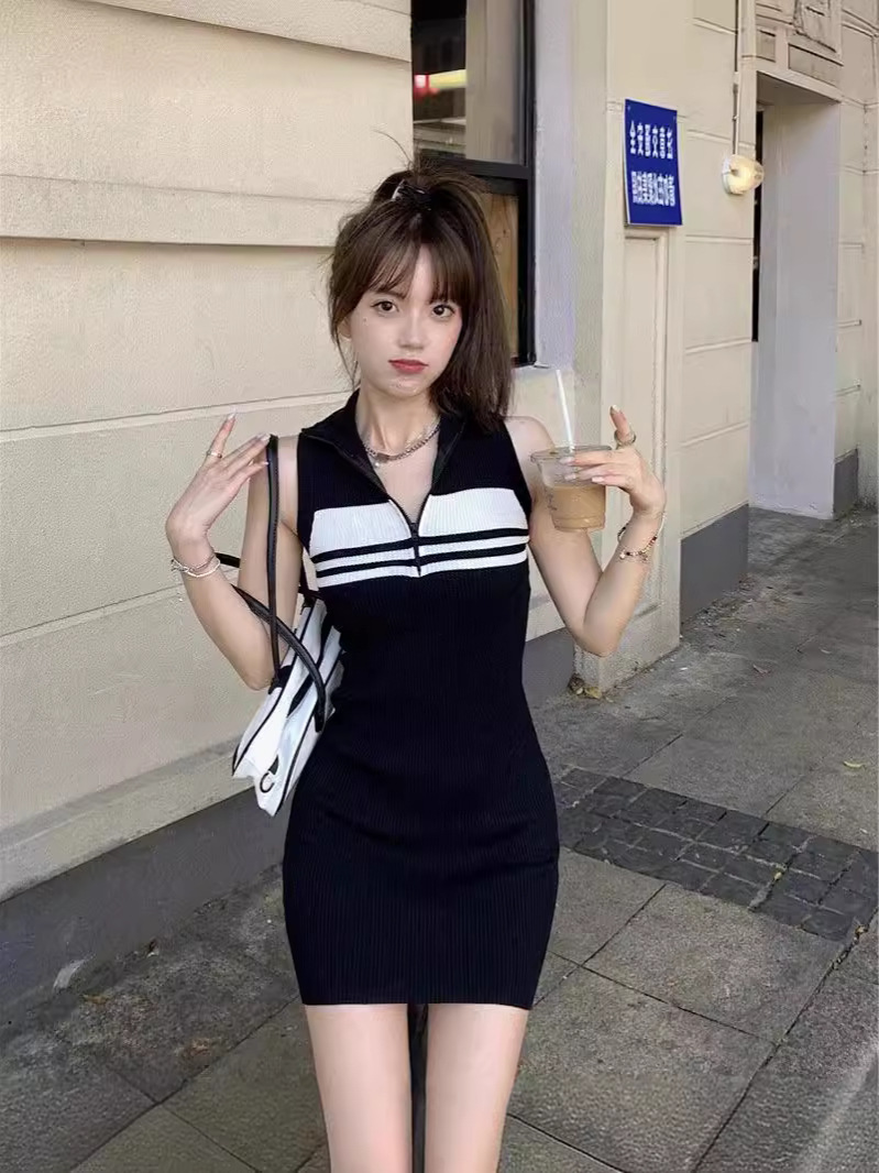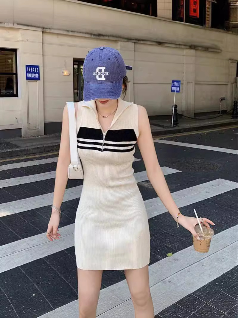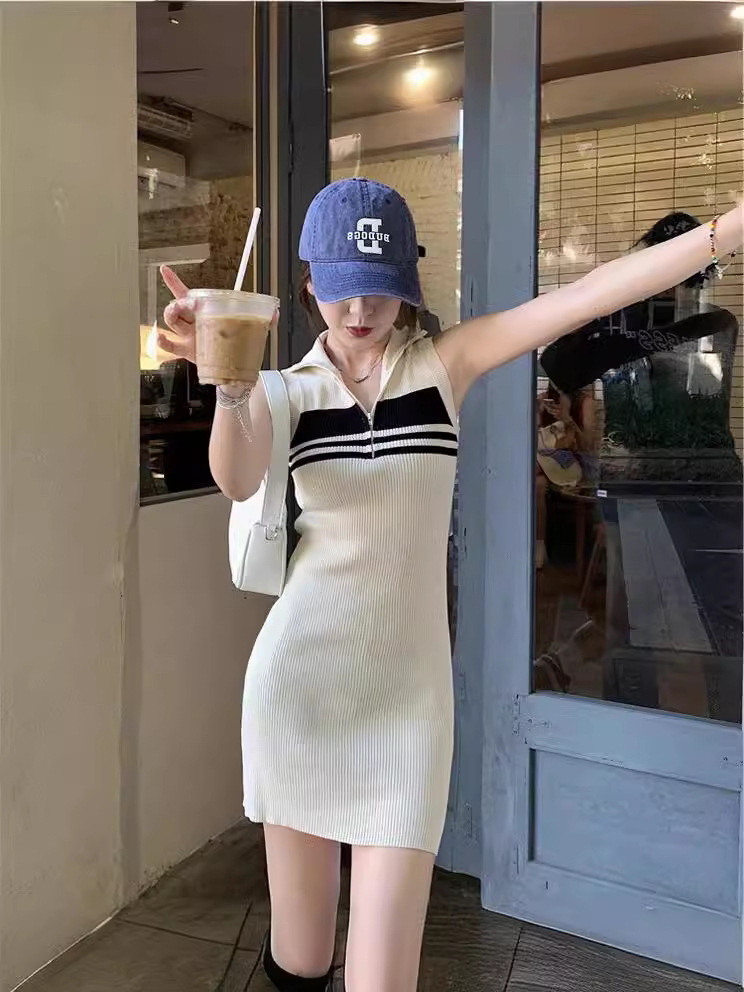 白色背心连衣裙新款夏季名媛休闲条纹运动风撞色针织包臀短裙