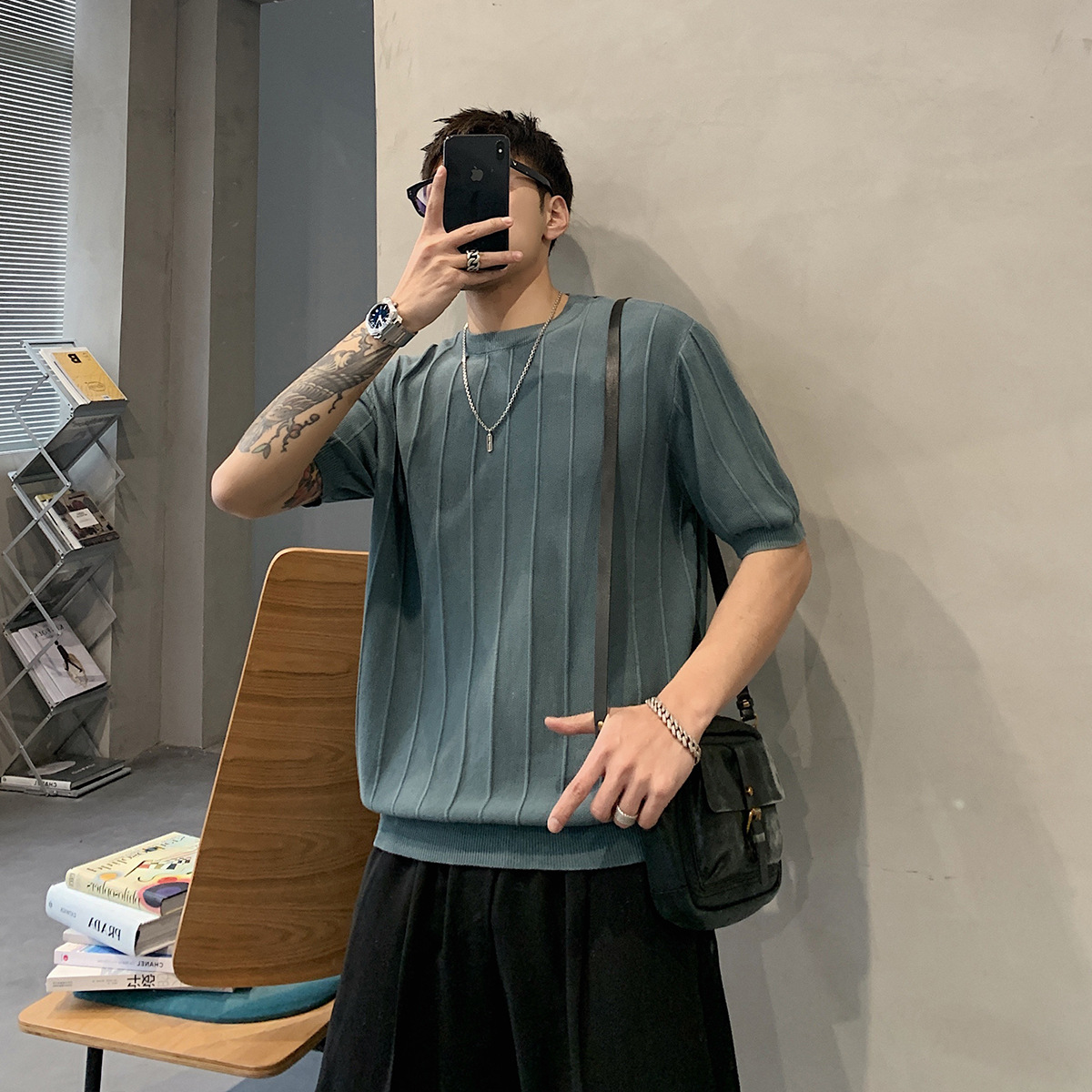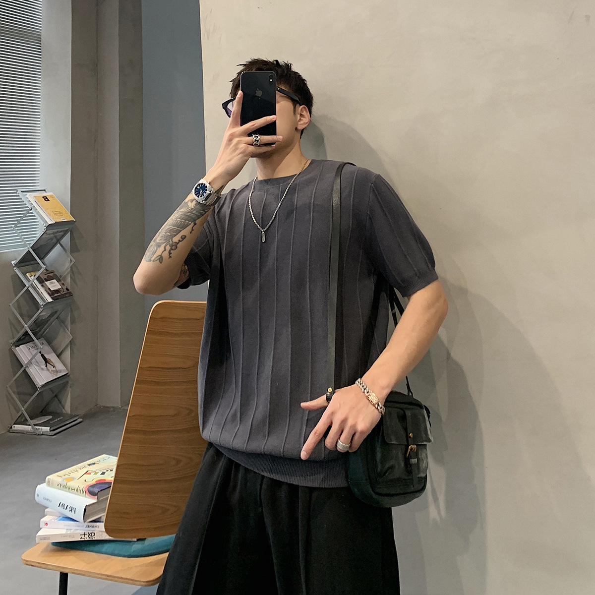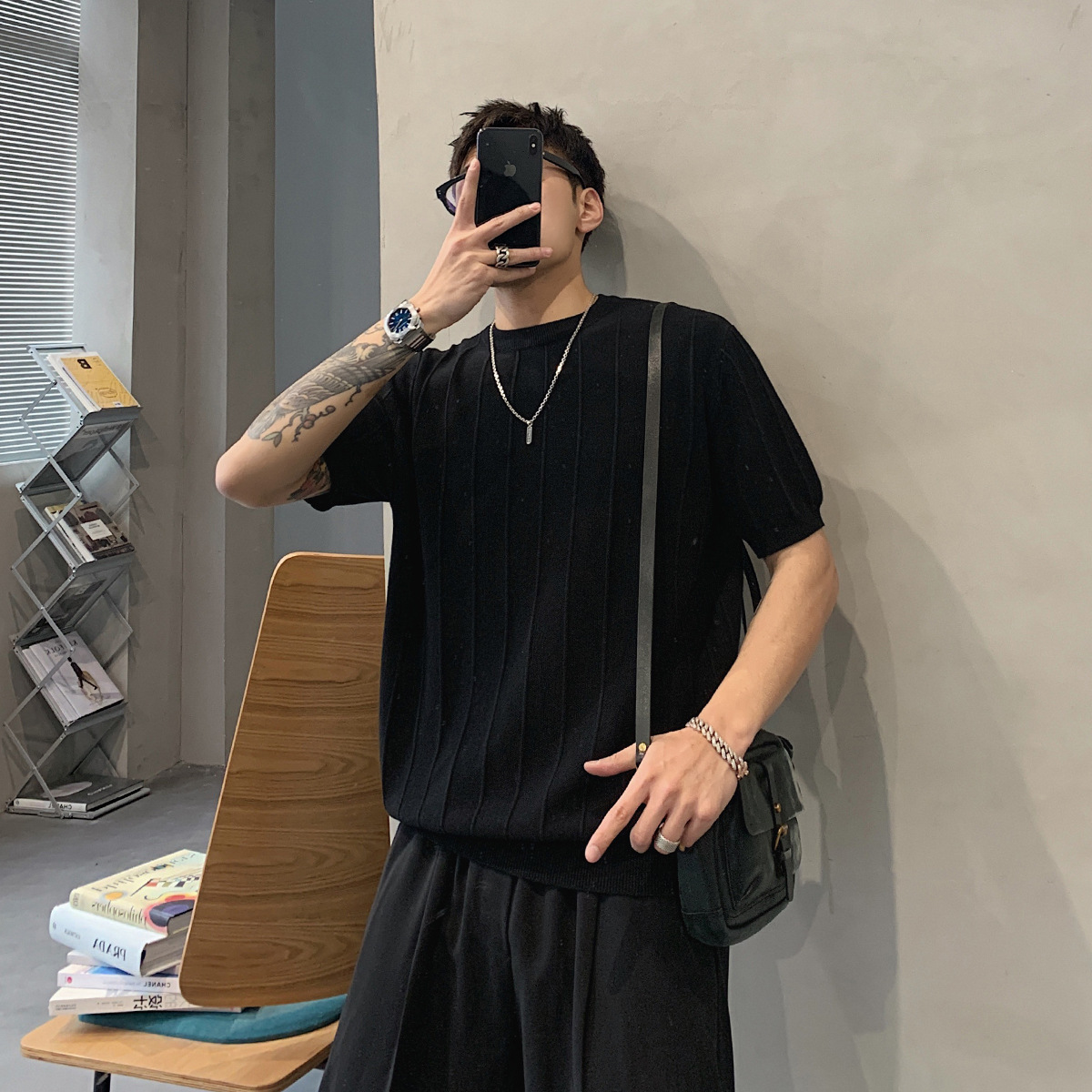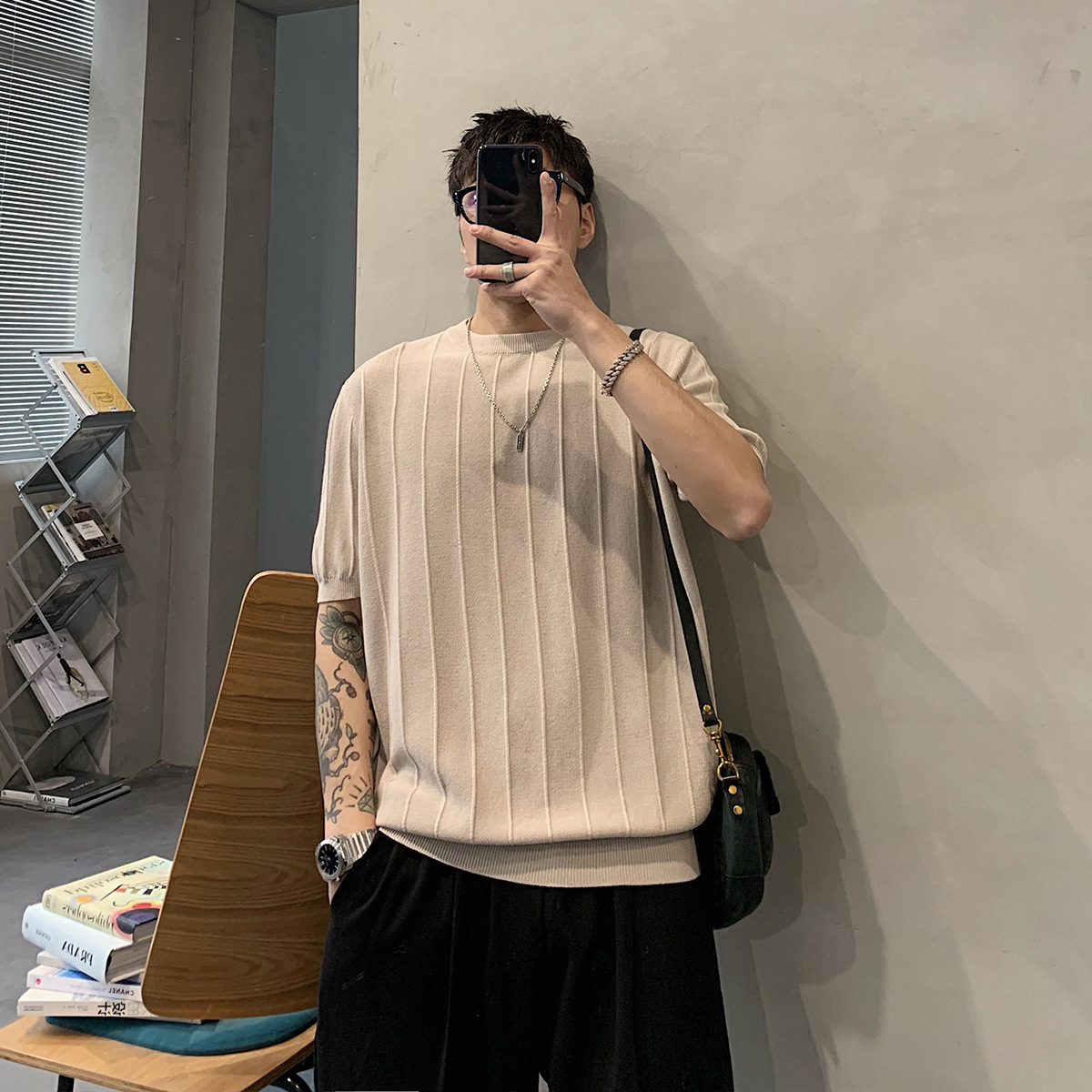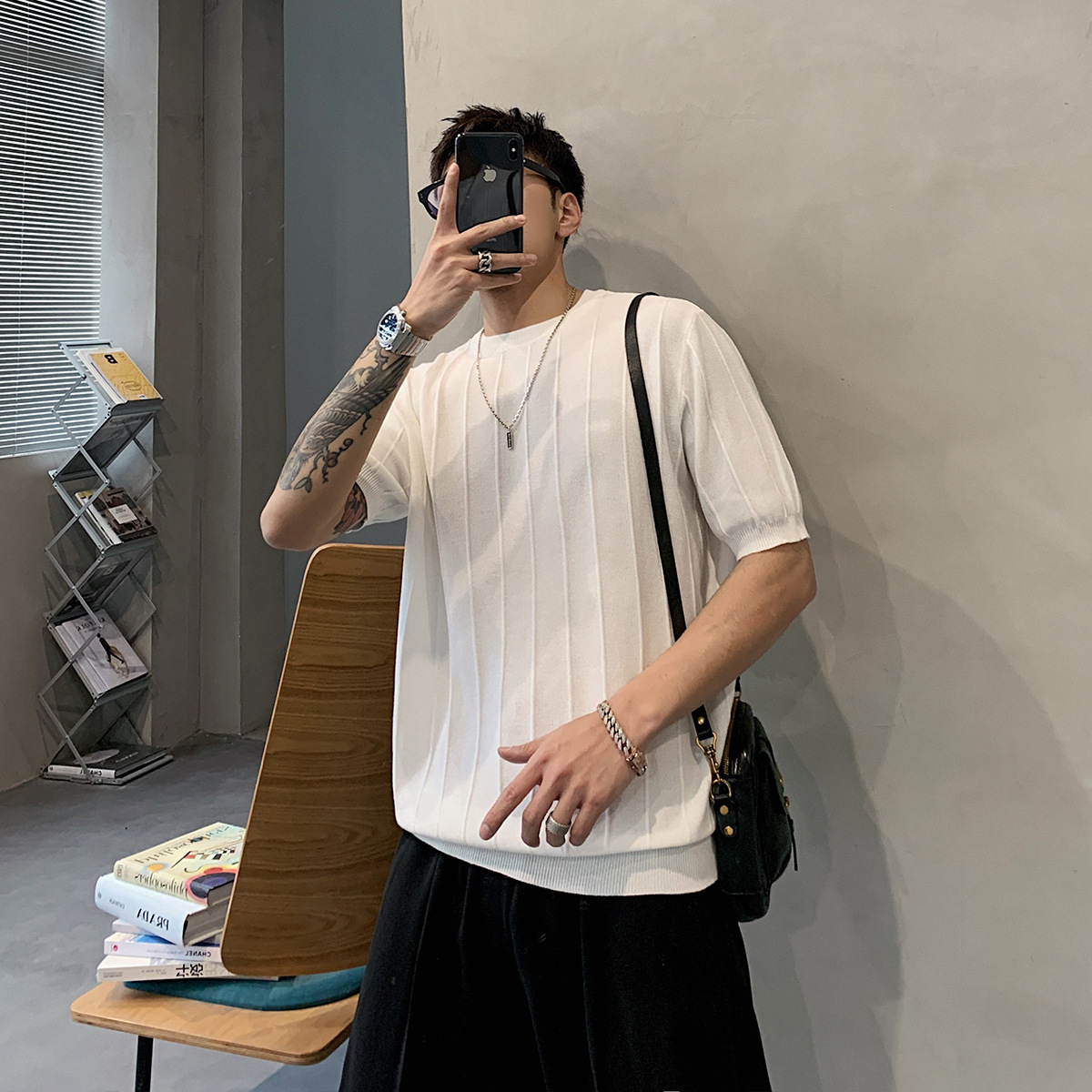 韩版冰丝针织白色圆领t恤男短袖潮流休闲半截袖简约体恤新款