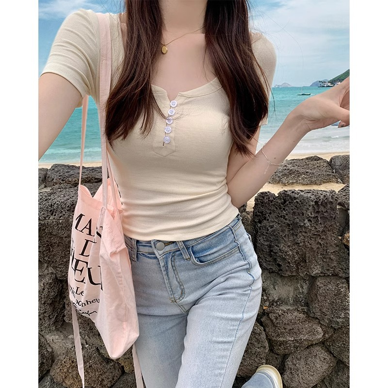 大领口性感纯欲锁骨短袖t恤女新款夏季低领正肩辣妹显胸上衣