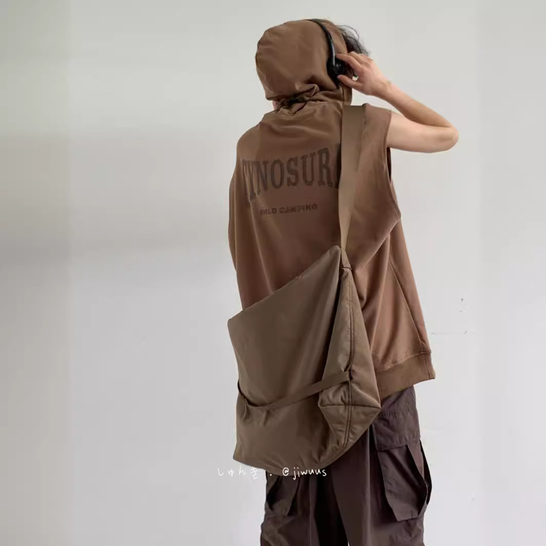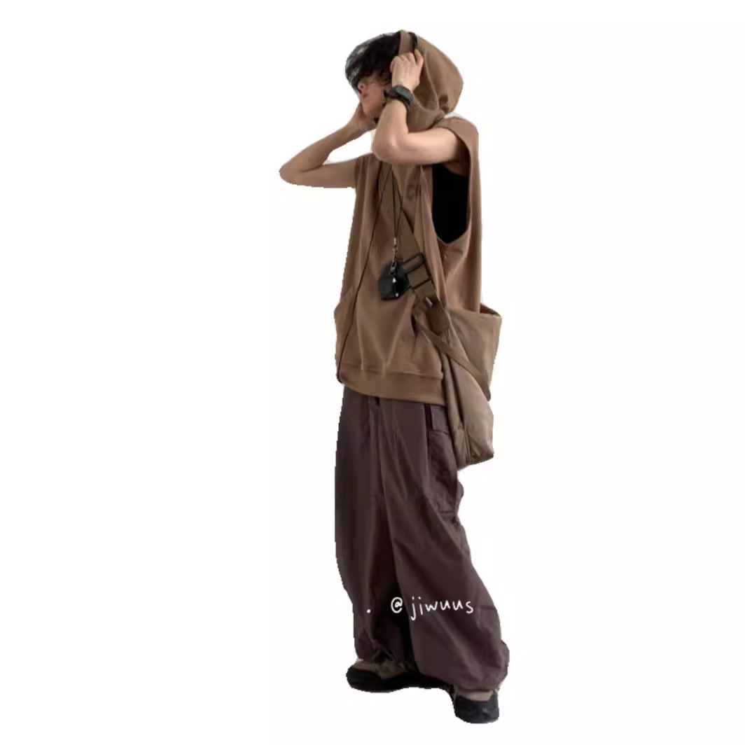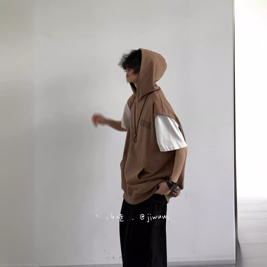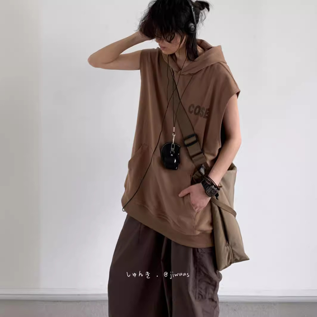 夏季美式复古连帽无袖背心男潮牌休闲宽松运动坎肩字母印花马甲男