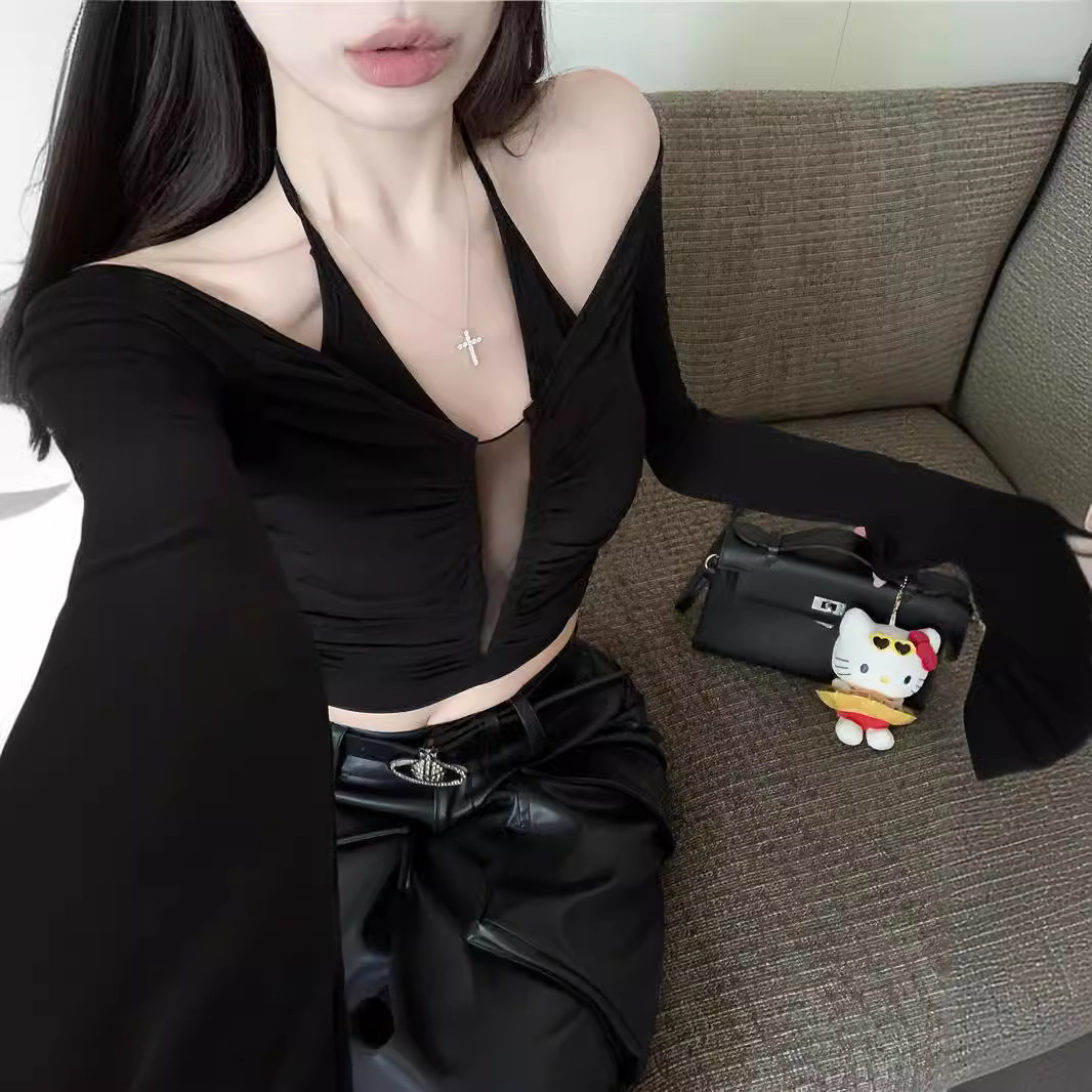 纯欲辣妹露肩挂脖打底衫女秋季新款设计感独特长袖t恤上衣欧货潮