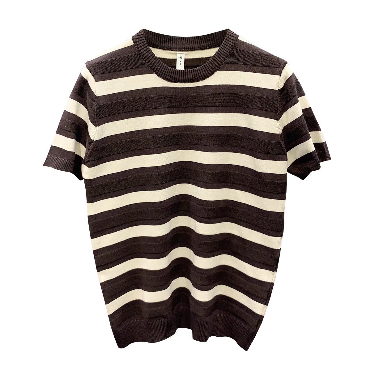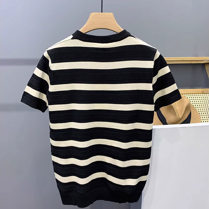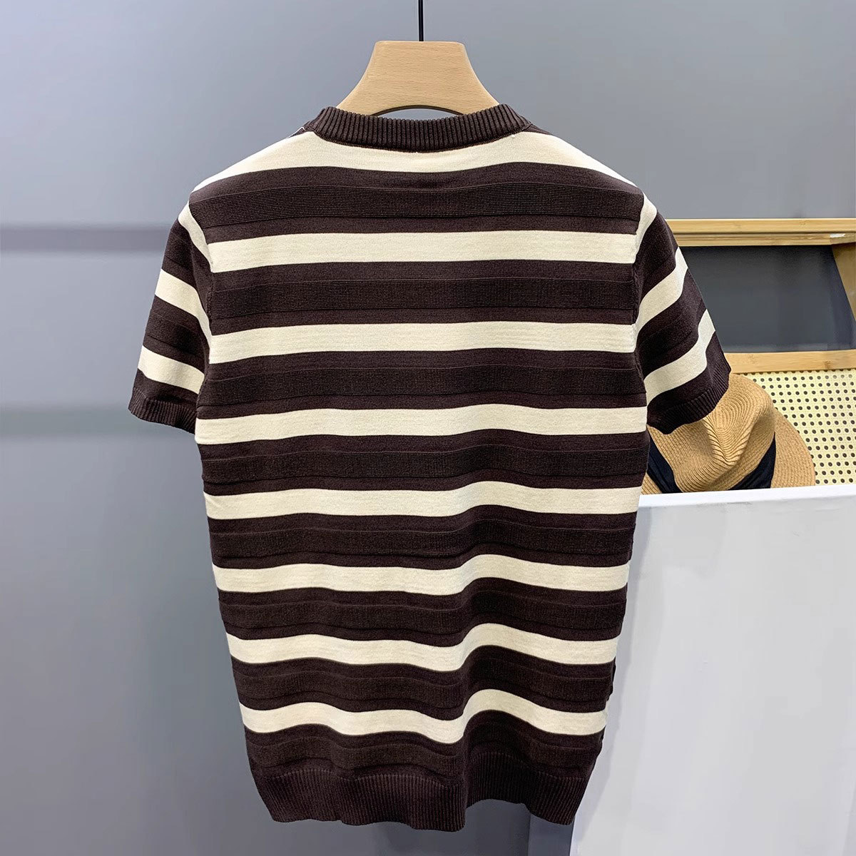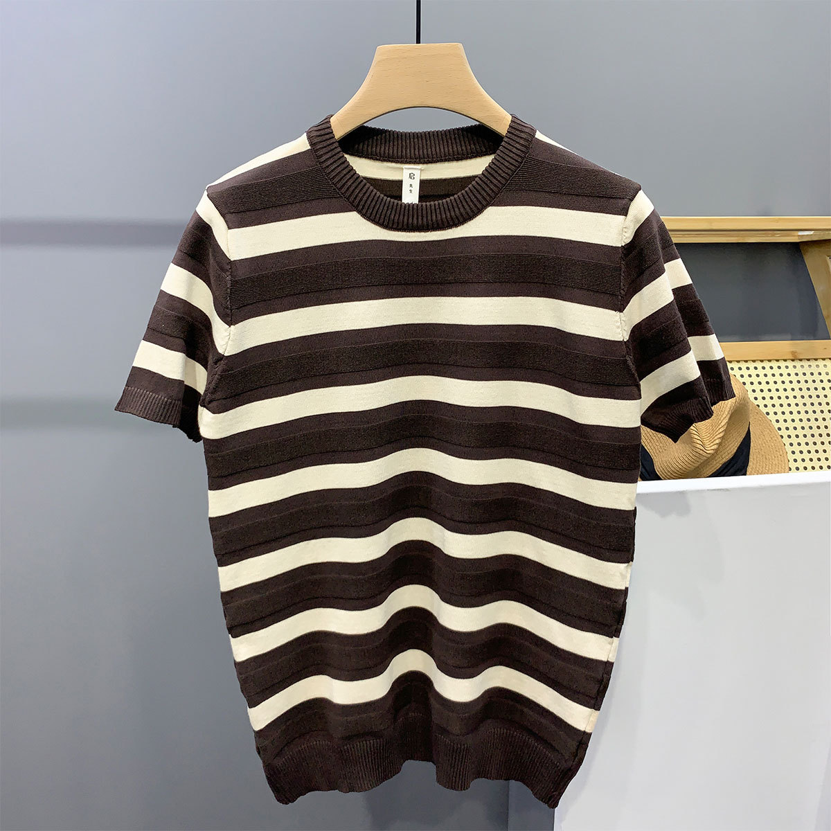 条纹针织冰丝短袖男t恤夏季新款潮流时尚痞帅男士圆领半截袖体恤