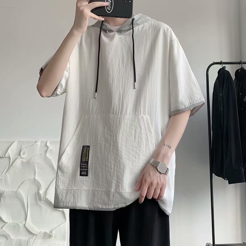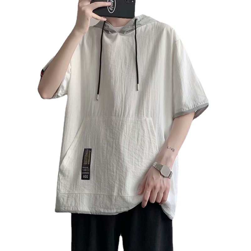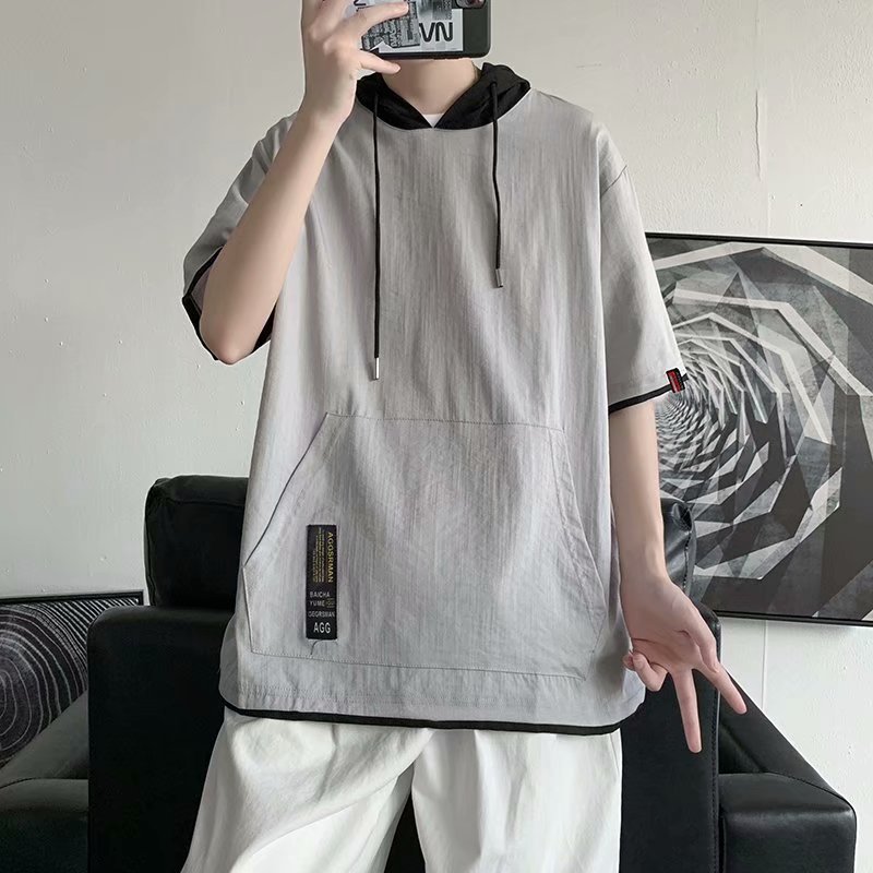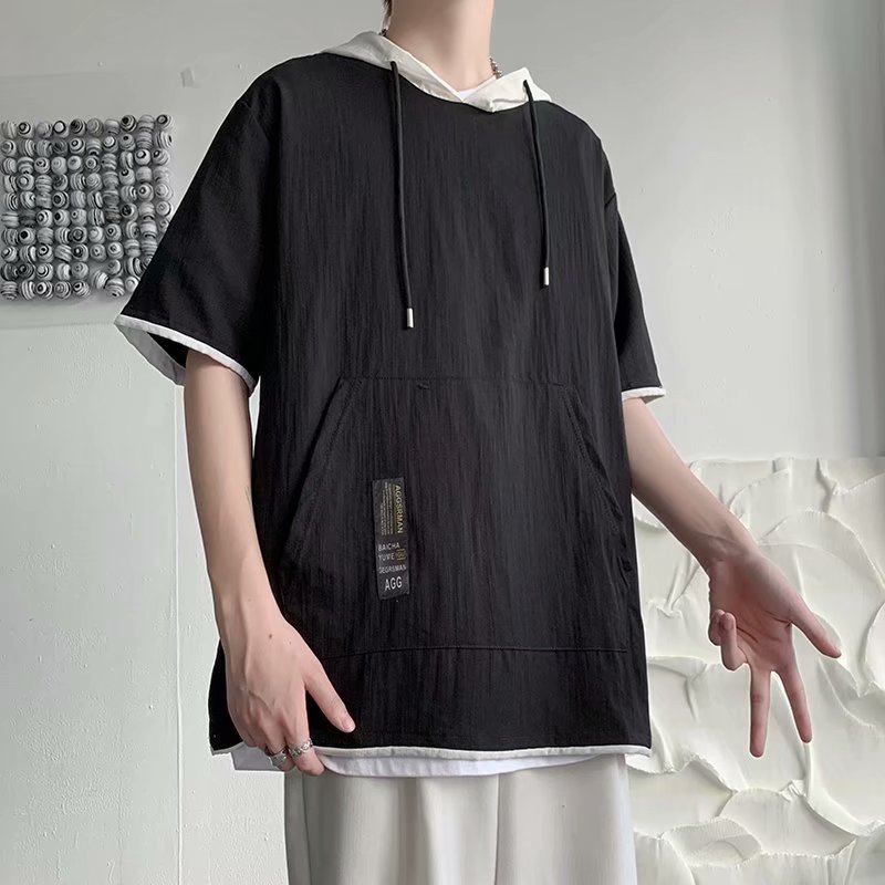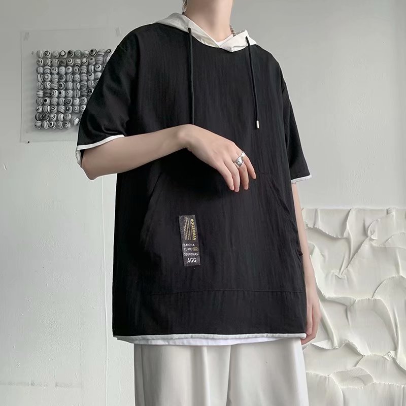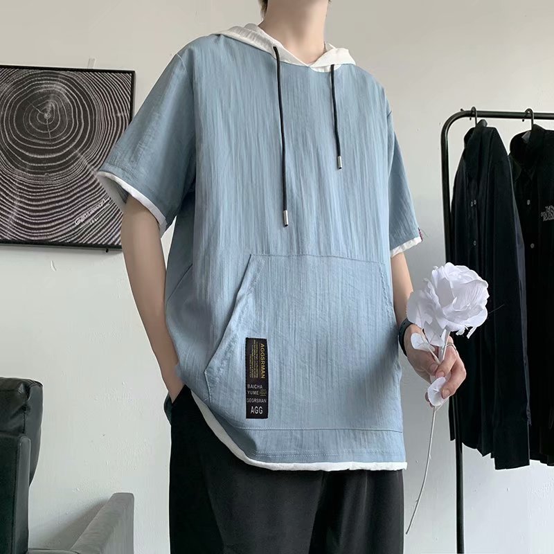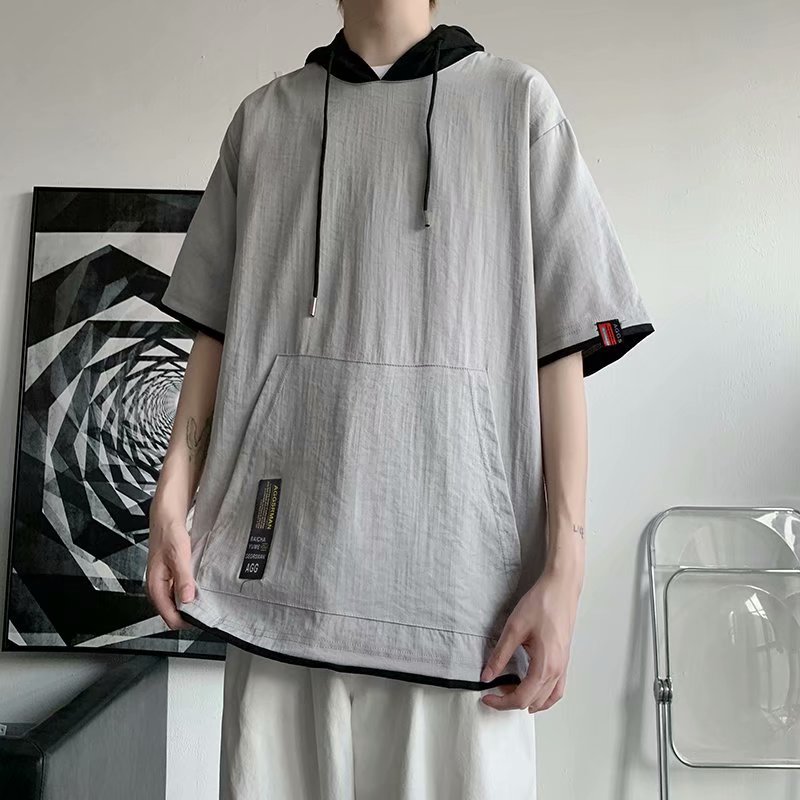 冰丝T恤短袖男连帽撞色假两件学生潮流五分袖上衣ins港风宽松夏季
