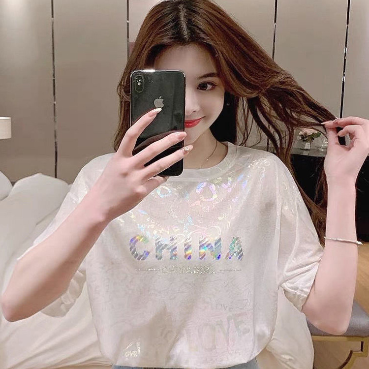 烫钻冰丝白色纯棉t恤女装夏季新款上衣短款短袖设计感小众