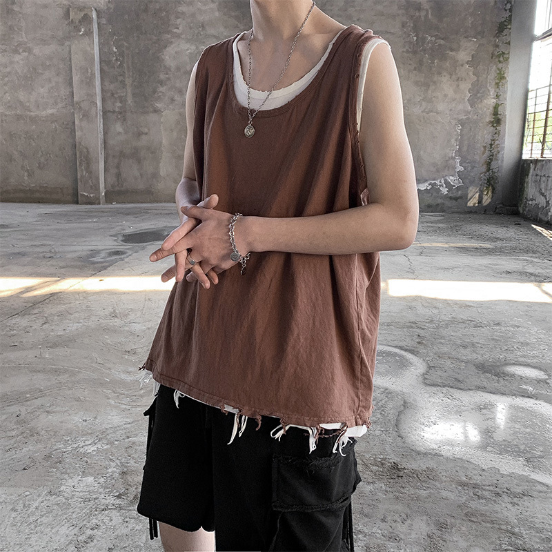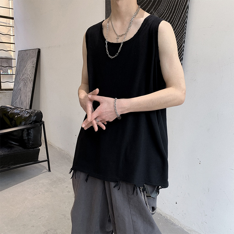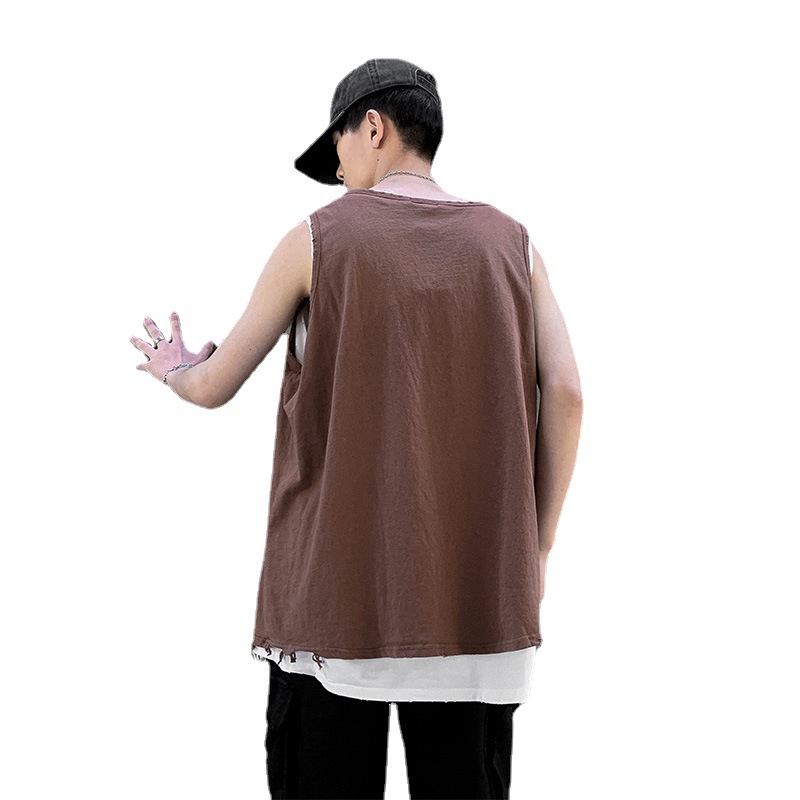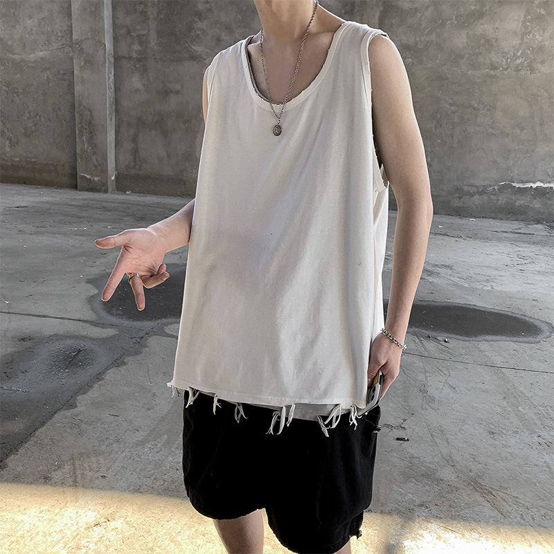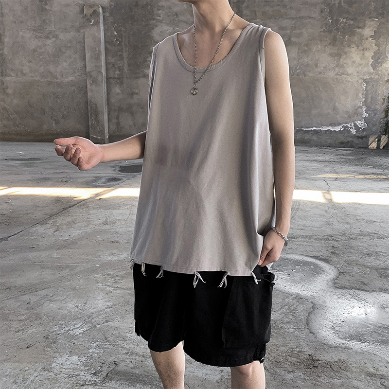 运动背心男生夏季ins潮牌个性纯色宽松百搭潮流烂边坎肩bf无袖T恤