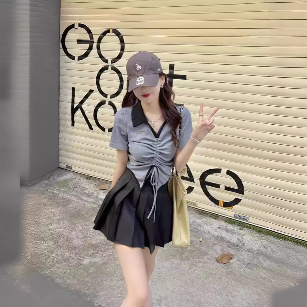 不规则V领抽绳褶皱正肩短袖T恤女夏季新款甜辣妹显瘦短款上衣