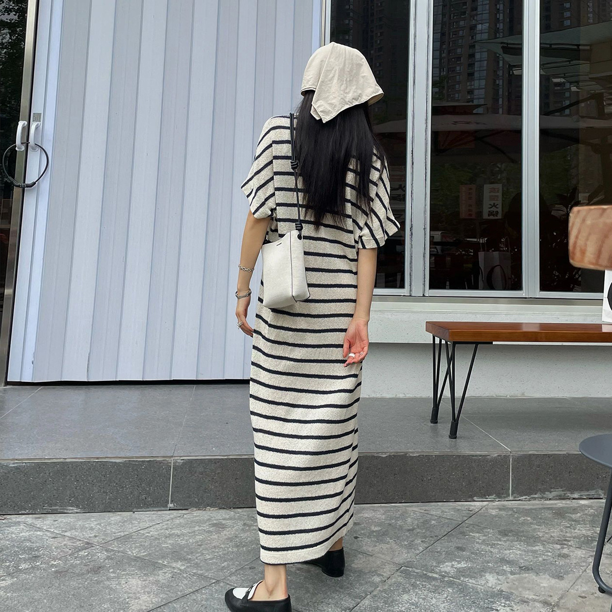 24春夏新款棉混纺休闲针织条纹POLO衫V领长款连衣裙