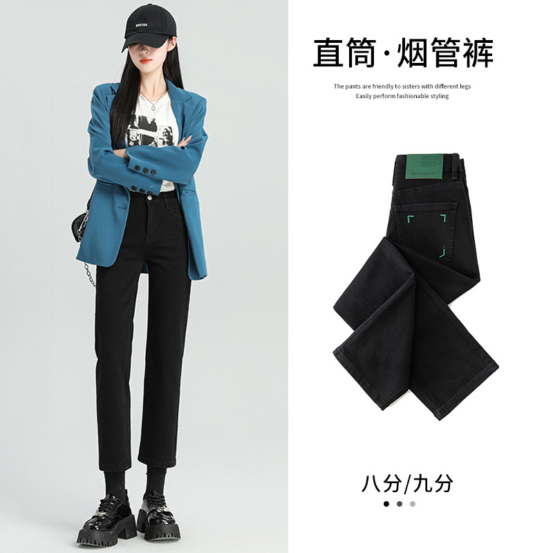 爆款超柔高腰小直筒牛仔裤女春季弹力黑色修身窄版烟管法棍裤