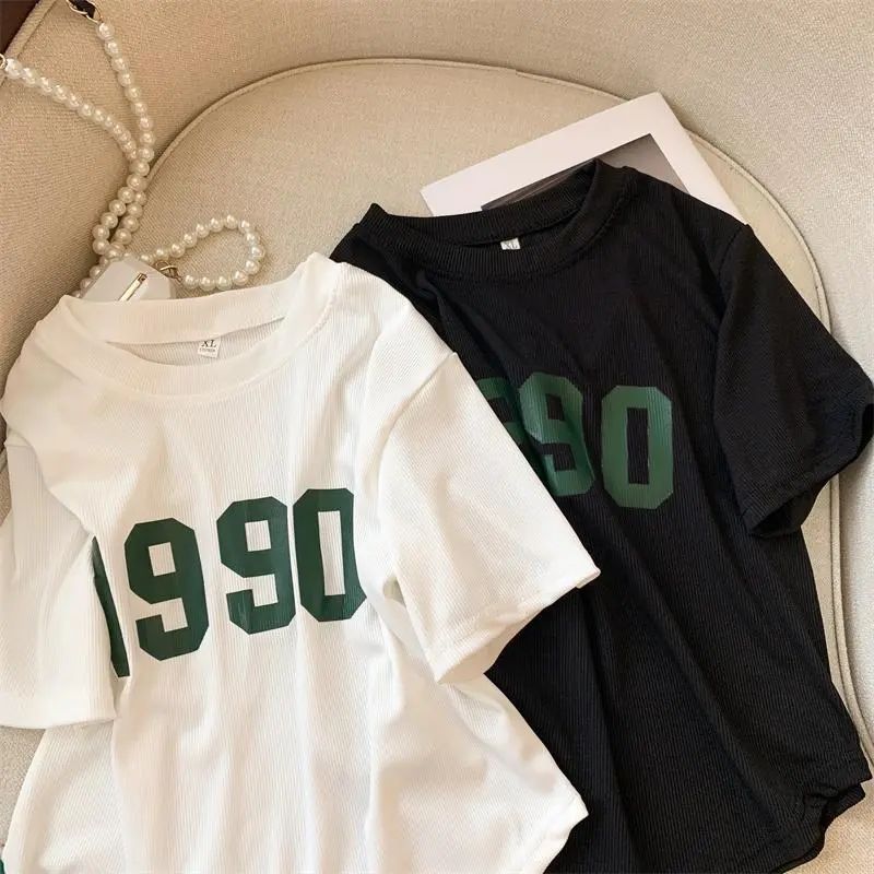 设计感chic短袖T恤女夏季圆领印花打底衫修身短款螺纹别致上衣潮